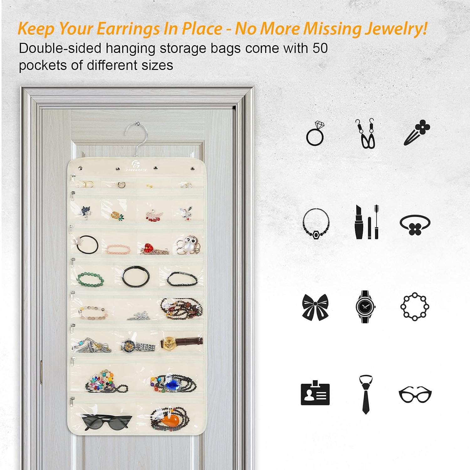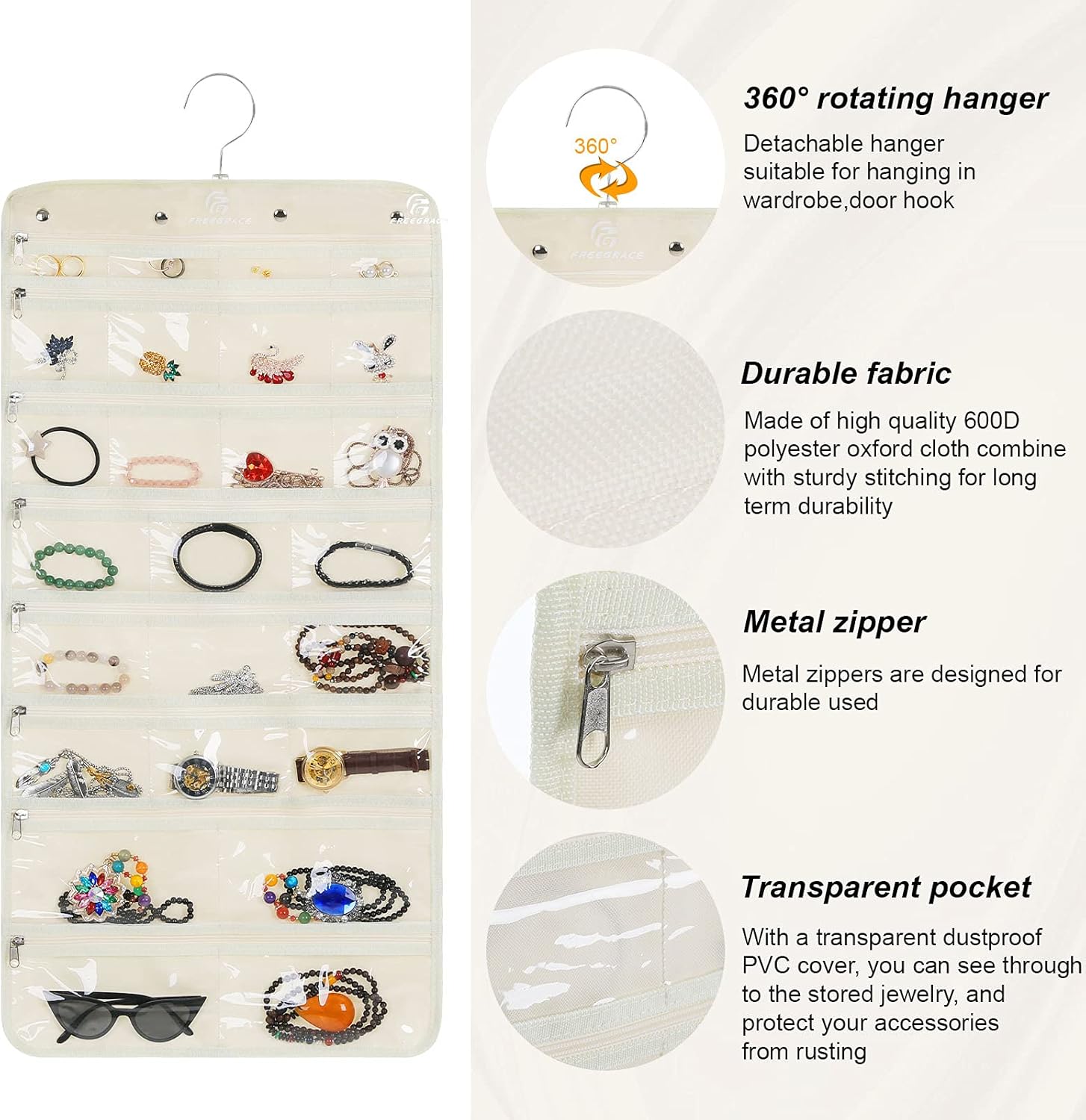 Freegrace Hanging Jewelry Organizer Revolving Hanger - Secure Zipper Closure - 50 Pockets - Foldable Storage & Display Solution - For All Jewelry & Bijoux (Beige)