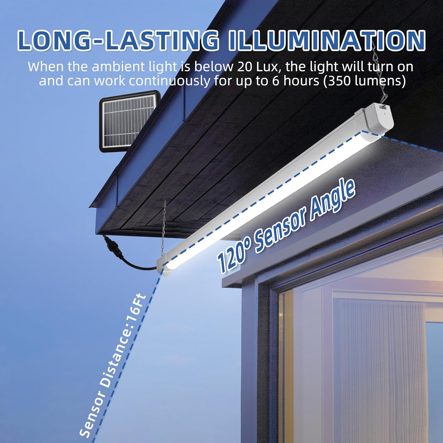 - Split Design: Hykolity solar powered shoplight with 15 feet/4.5M wire, fit for outdoor and indoor. The solar powered shop light and the solar panel are separated, and the waterproof wire length is 15 feet, so it can be used indoors and outdoors such as shed, gazebo, balcony, garage, barn, home, garden, yard, patio, park, porch,chicken coop, pavilion