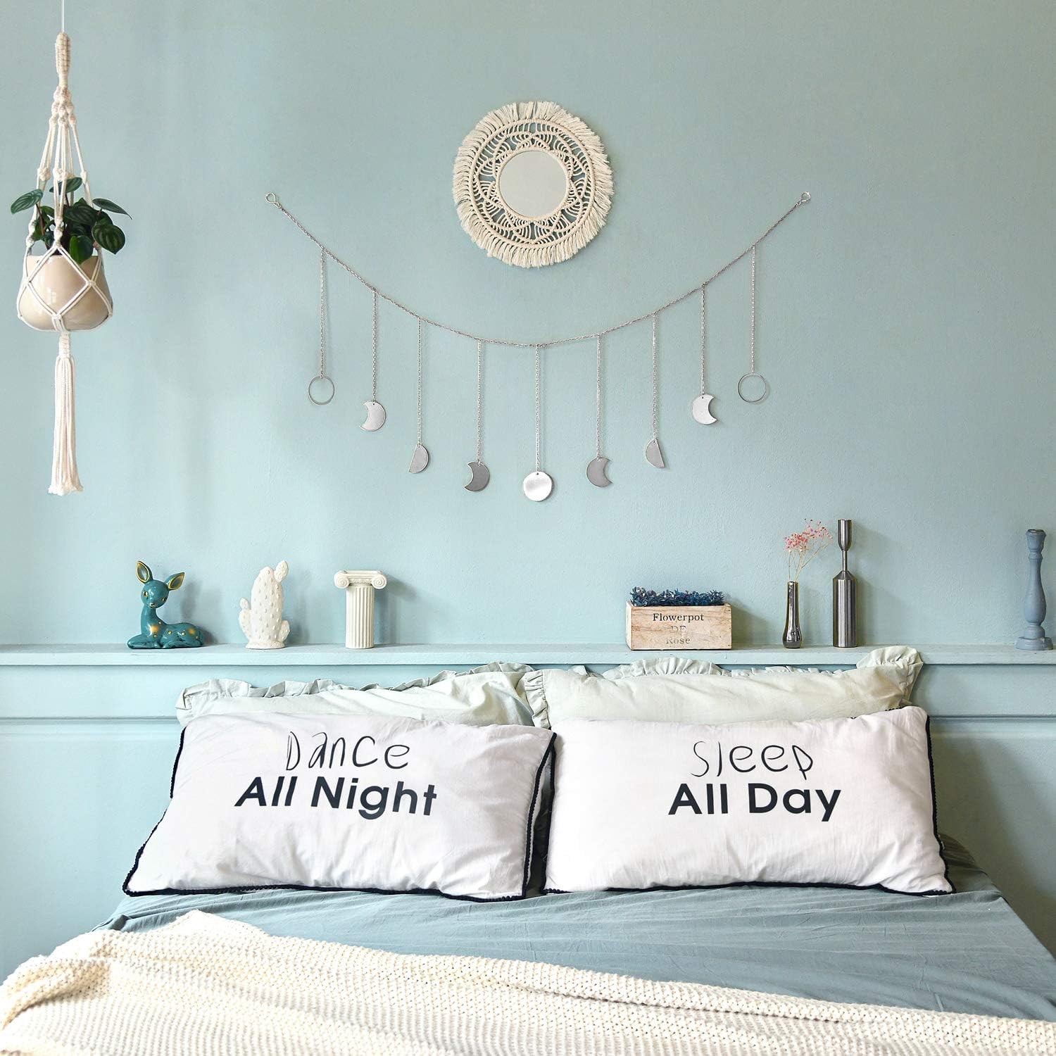 Mkono Moon Phase Wall Hanging Boho Aesthetic Room Decor Metal Moons Garland Hanging Art Bohemian Home Decoration for Girls Room Nursery Bedroom Livingroom Dorm, Ideal, Silver, 50"