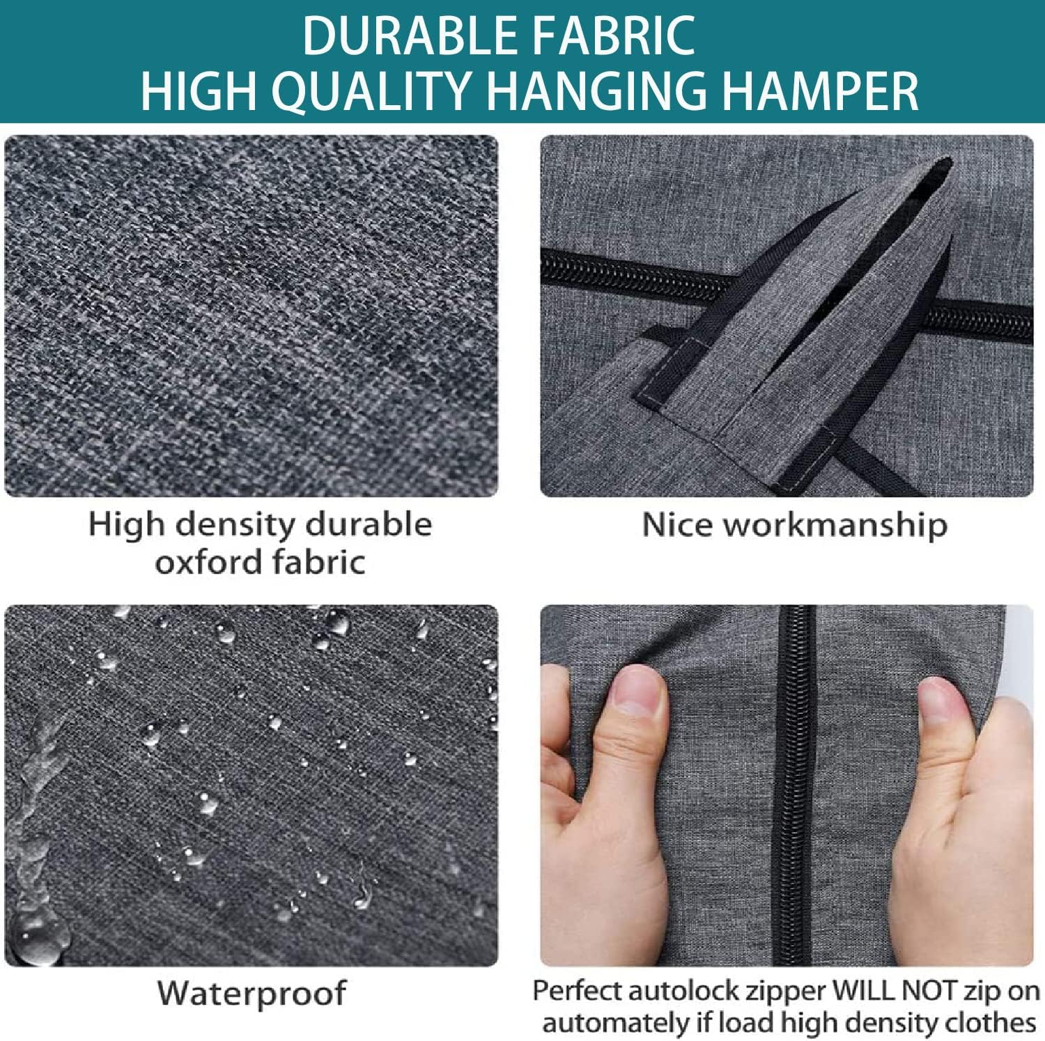 - 【DURABLE FABRIC AND MATERIALS】This over the door hamper bag is made of durable 600D tear-resistant oxford fabric,waterproof and machine washable.The reinforced sewing thread for whole laundry bag,plus the double lock stitches on zipper that help extend the service life of this hamper, it can be used even more than 5-8 years.Very good value for money.