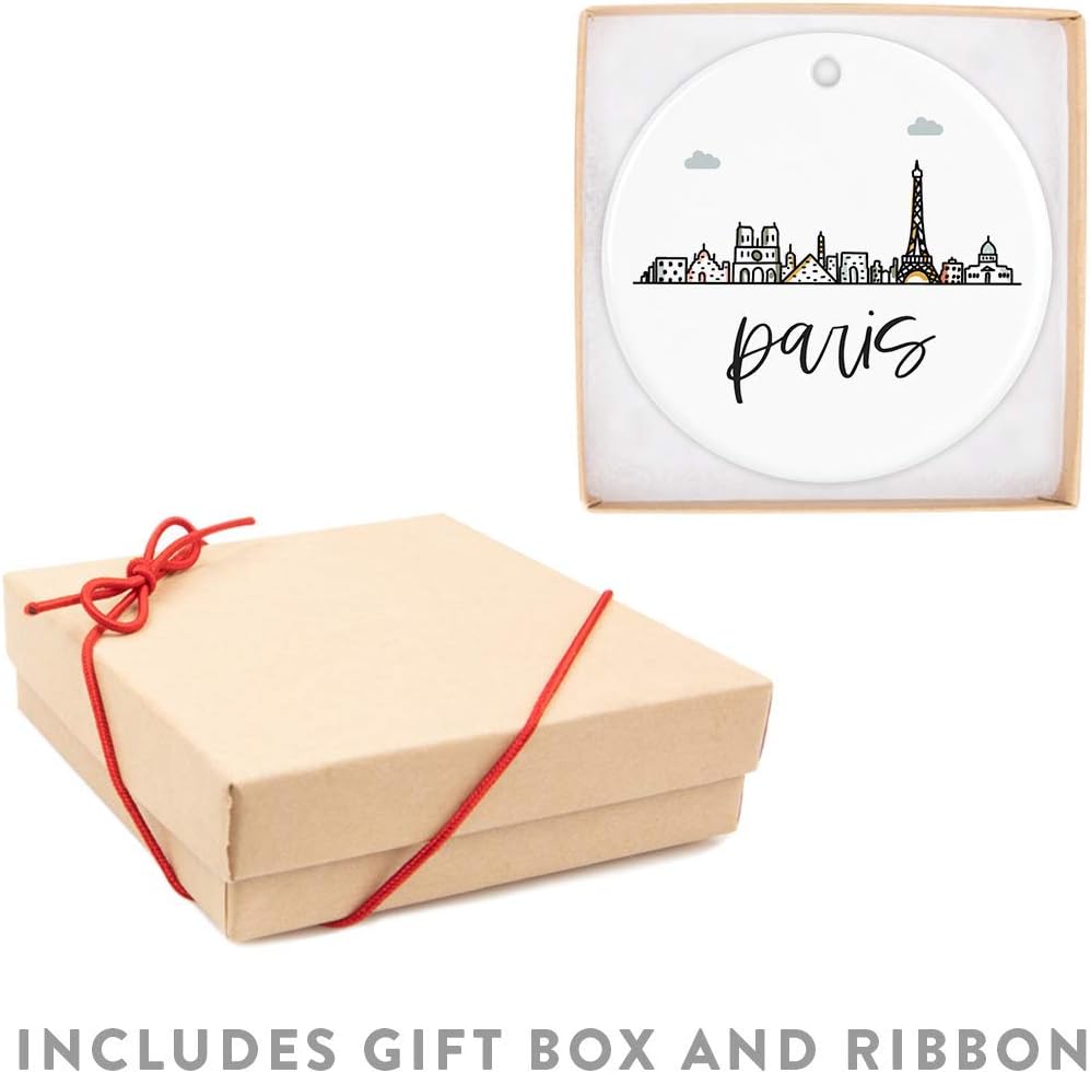 Andaz Press Round Ceramic Porcelain Christmas Tree Ornament Keepsake Gift, Paris, Colorful International City Skyline Graphic, 1-Pack, Birthday Ideas Family Coworker Him Her, Gift Box