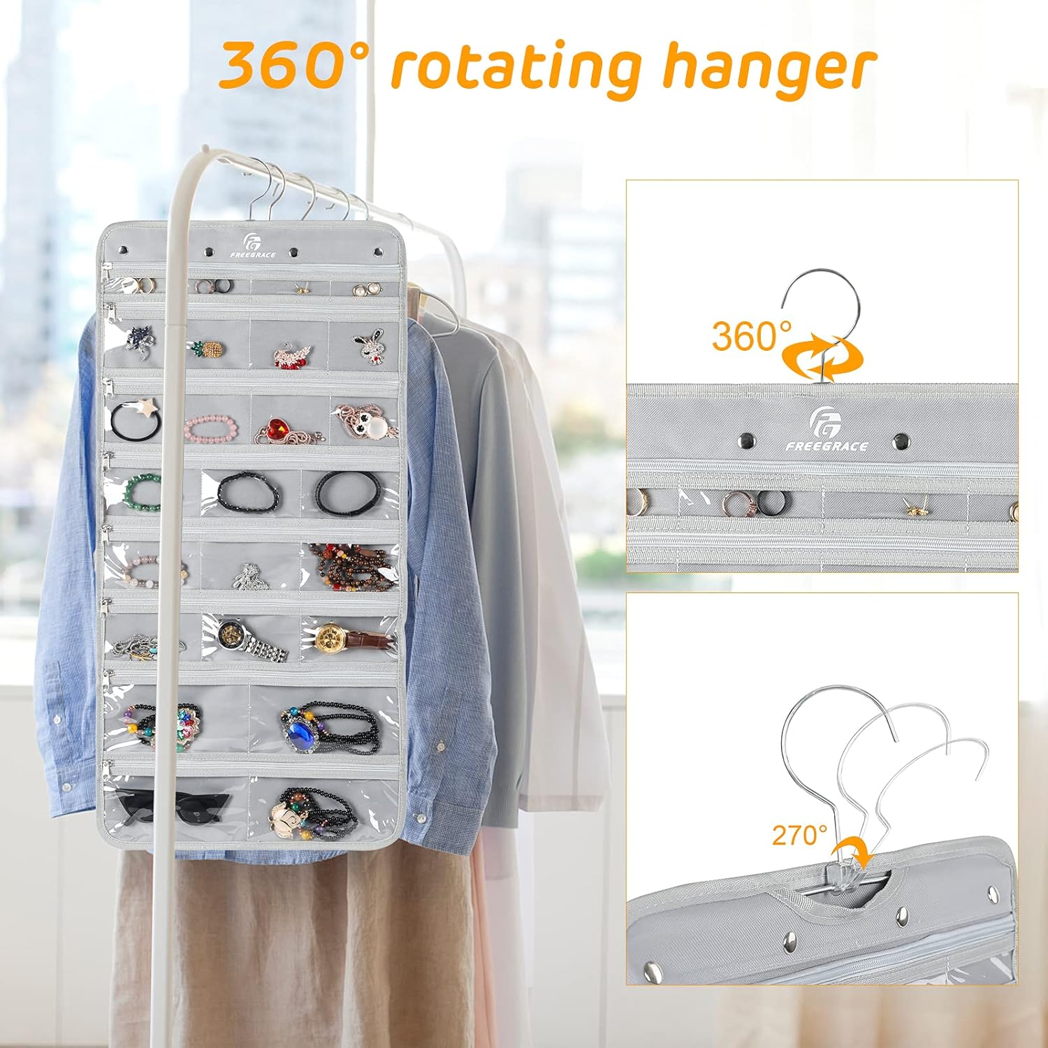 Freegrace Hanging Jewelry Organizer Revolving Hanger - Secure Zipper Closure - 25 Pockets,23 Hooks - Foldable Storage & Display Solution - For All Jewelry & Bijoux (Gray)