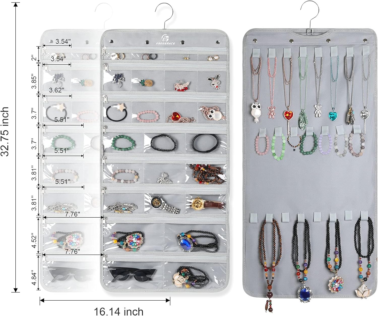 - QUALITY MATERIALS: Freegrace’s sturdy hanging jewelry organizer is made of 600D polyester Oxford fabric and has a PU backing (SIZE: 32.7’’ x 16.5’’). The pockets are made of transparent PVC to allow you to see through to the stored jewelry, and the zipper and revolving metal hanger are well-made and durable.