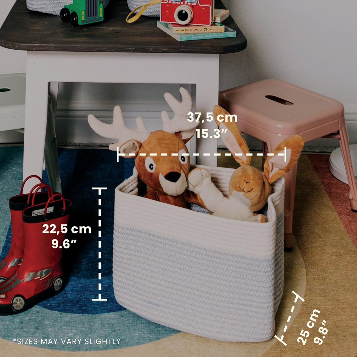 - All-Purpose Rope Storage Baskets – These 15” x 10” x 9” rope storage baskets are ideal for keeping your everyday home life more organized and provide plenty of compact storage space for arts and crafts, classroom decor, kid’s toys, or nursery room accessories