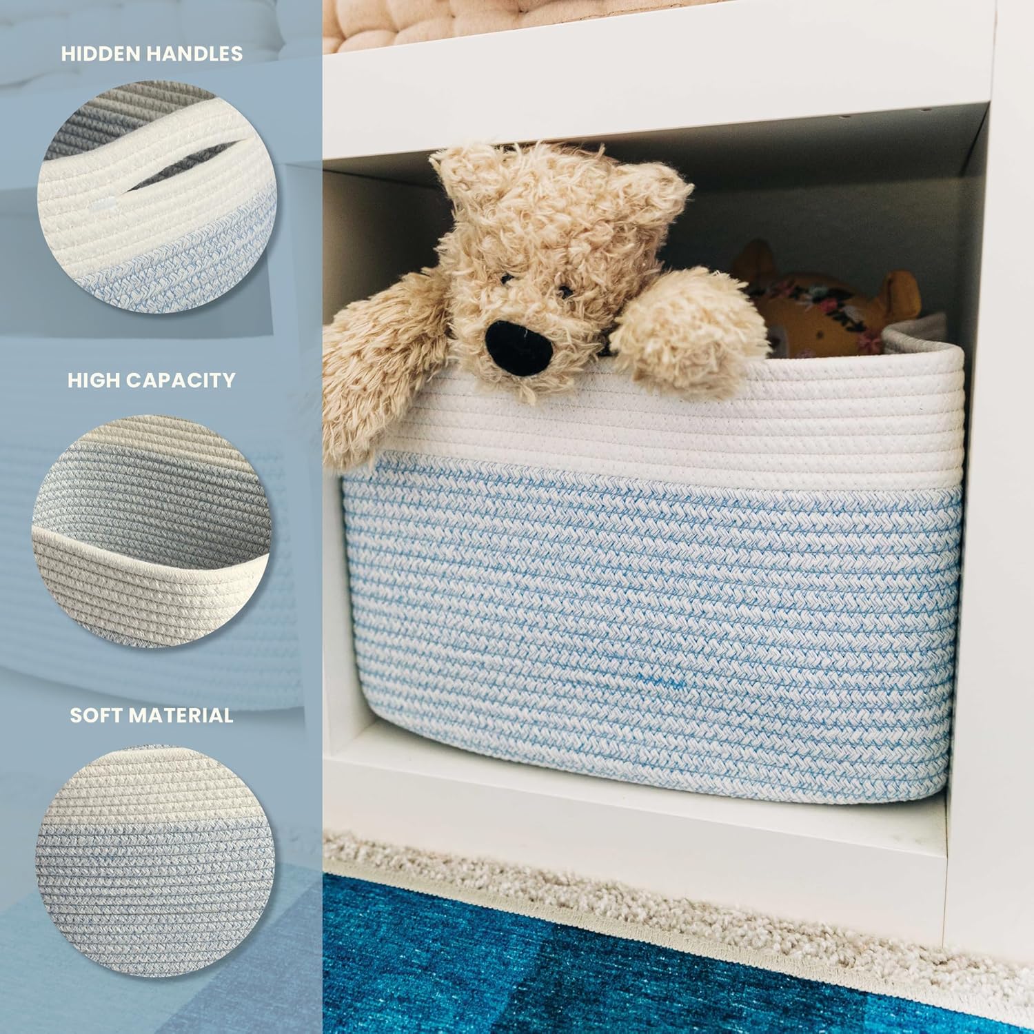 - Discrete, Built-In Carry Handles – These fabric rope baskets for storage also feature slim hand holds built right into the sides of each basket for a seamless look that’s also functional. Perfect for picking up toys or carrying items around the house.