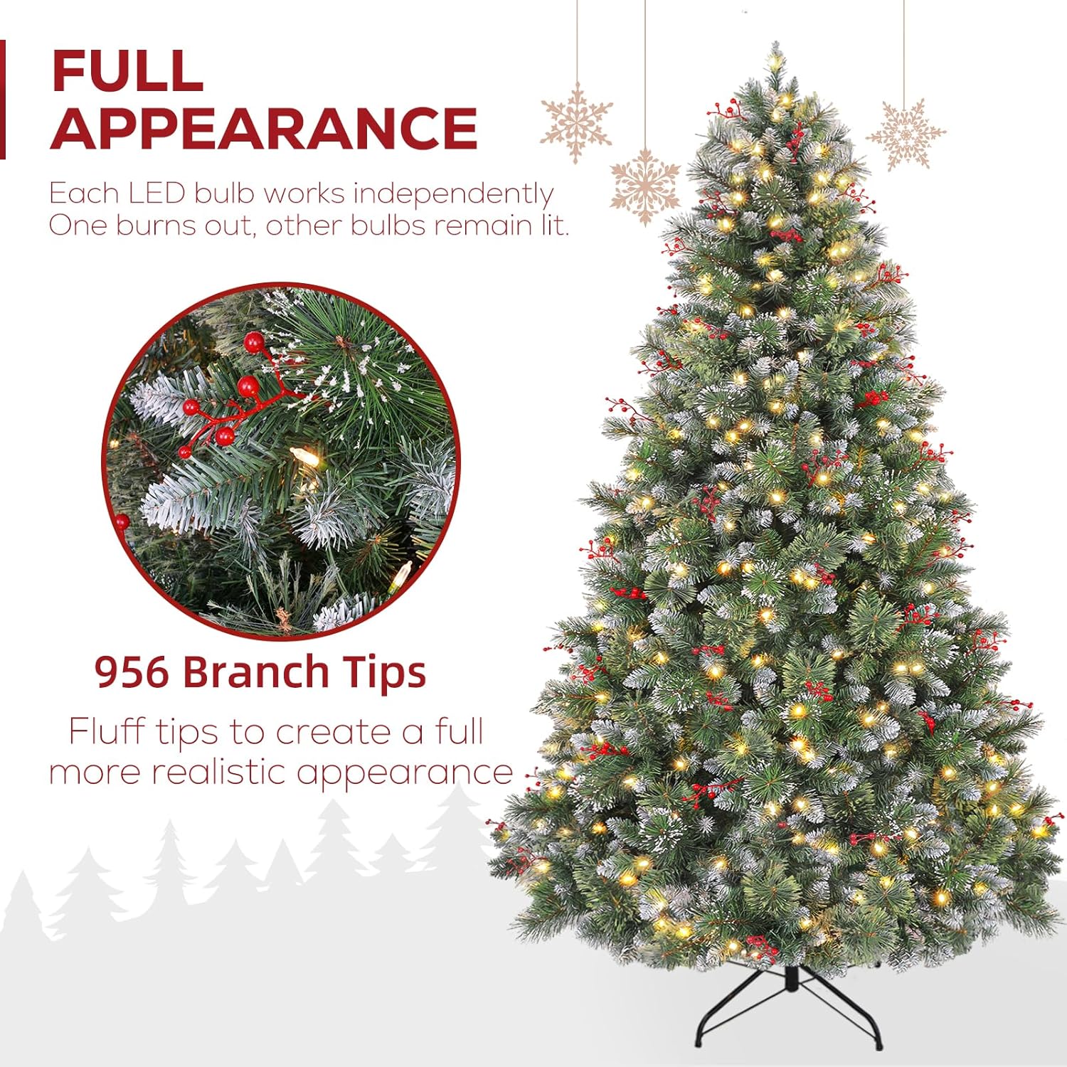 - Natural & Lush Look: Experience a luxuriously full 6ft Christmas tree adorned with 956 PVC branch tips and realistic red berries. Snow-dusted pine needles create an enchanting wintry charm, while hassle-free assembly and ample decoration space ensure effortless elegance.