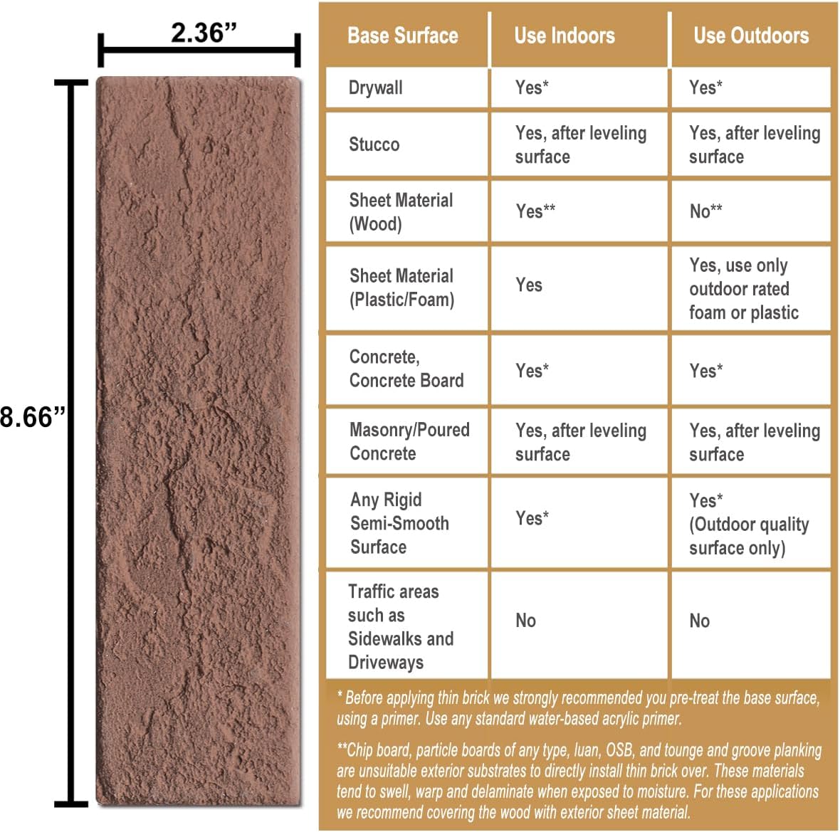 - Made from durable inorganic mineral powder and poly-acrylic binder, with a matte texture finish. The thin brick veneer is flexible and can be used on curved walls. NOTE: it is recommended to spray primer on the brick surface to avoid stains and oil if used in the kitchen.