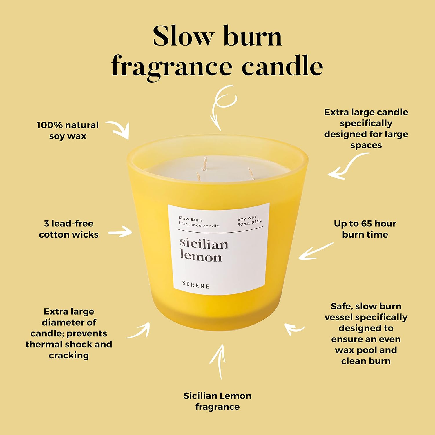 Hidden Label Large Scented Candle, Sicilian Lemon, 30oz 3 Wick Huge Candle, Serene Collection Slow Burn Natural Soy Candles for Home Scented