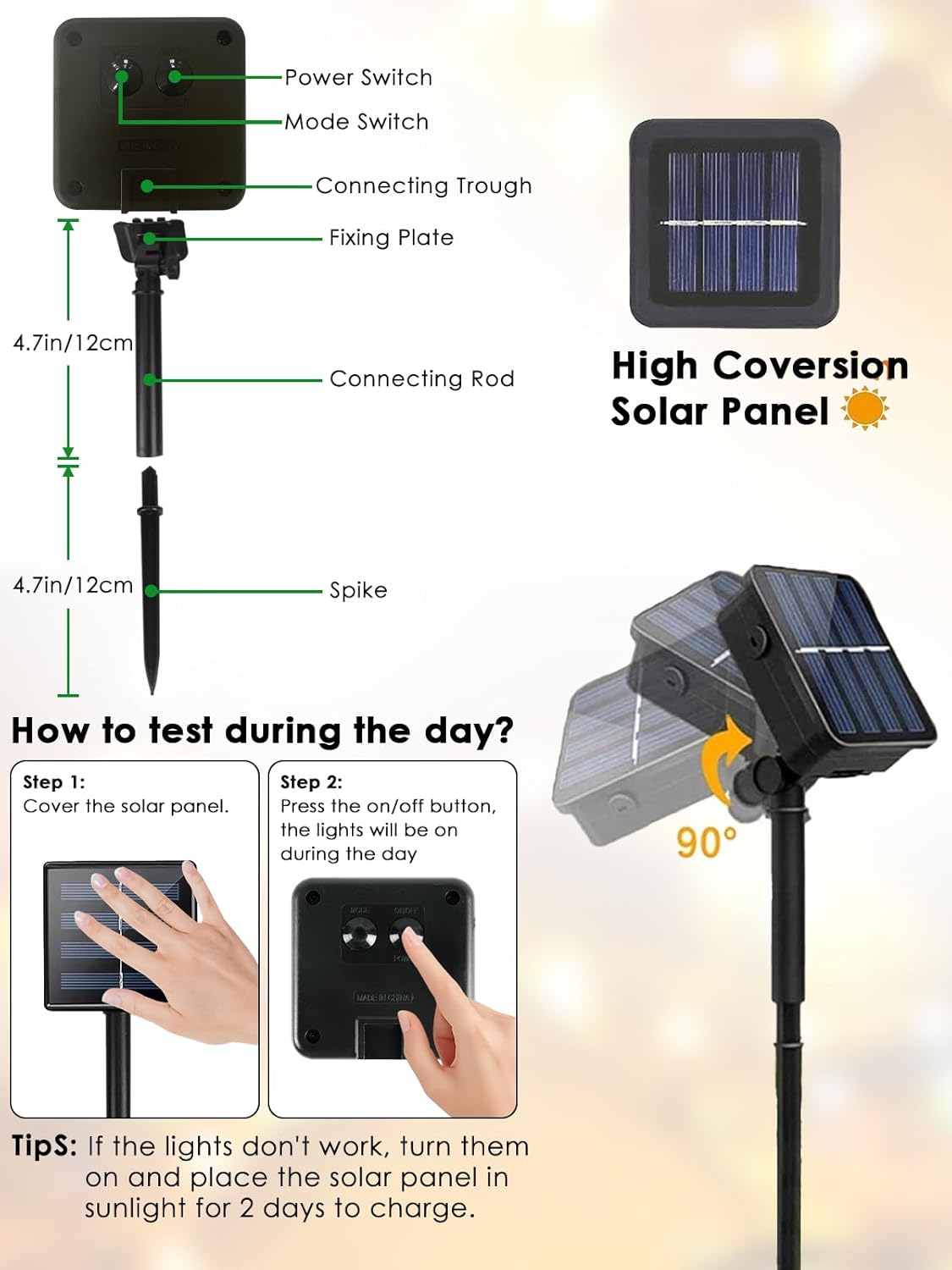 - 8 Modes and Memory Function: Our solar twinkle lights feature an ON/OFF button and a mode button located at the back of the solar panel. You can select 8 different modes to satisfy your diverse needs by pressing the mode button. And the built-in memory chip saves your last modes setting, so there is no need to reset it
