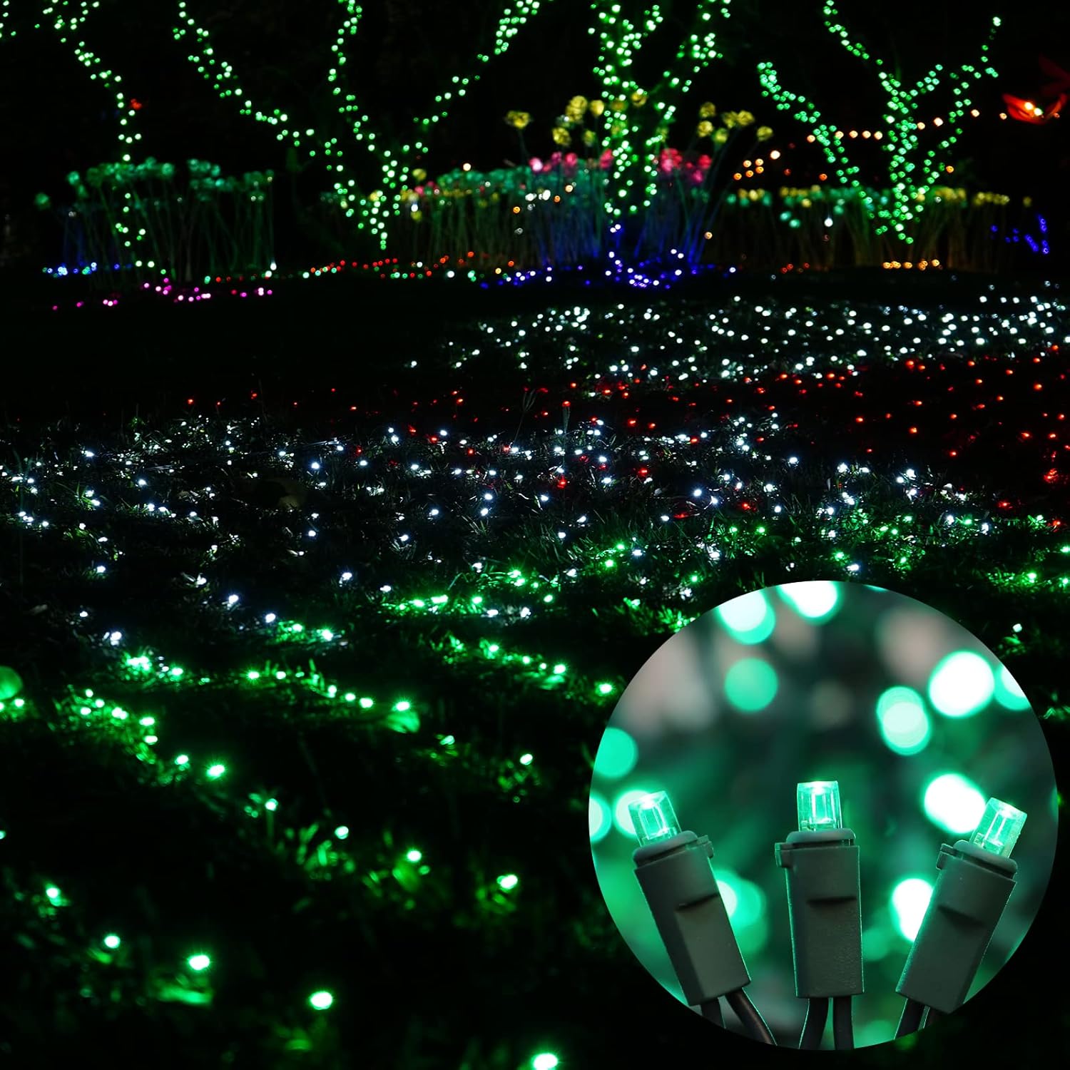- Safe to use: Just plug or unplug to turn the light on or off. There is a fuse inside the plug to protect the lamp from burning out. UL588 safety certification, you can rest assured to use, very safe.The little bulbs in green wire color create a 360-degree flash that's super bright and festive, brightening up your holiday with warm sunlight and enough brightness.