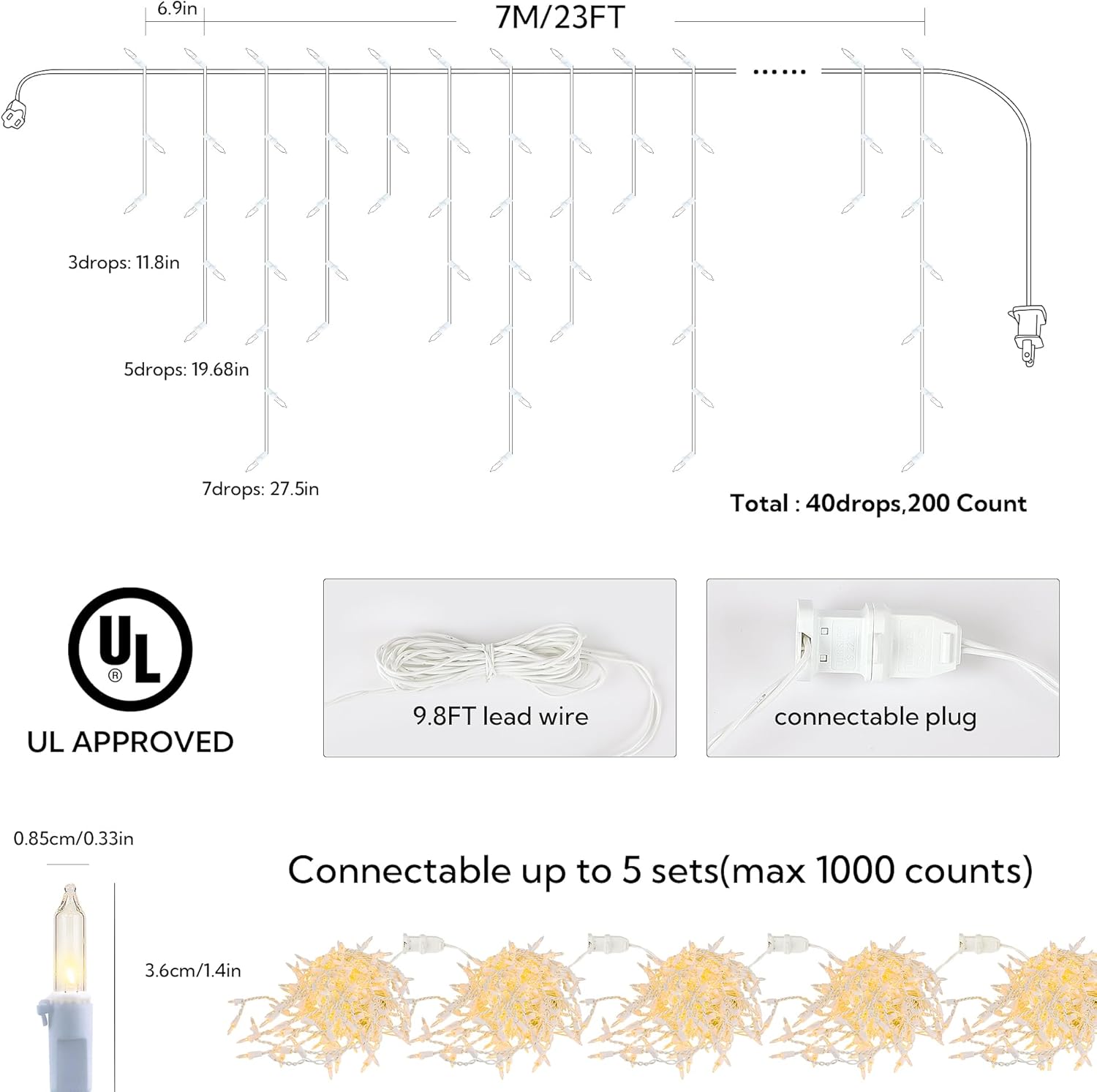 - ⛄*Incandescent Christmas Icicle Lights*-Bright 200 traditional clear incandescent icicle lights on white wire,32.8ft total length(Wire with light 23ft+Lead wire 9.8ft) with 40 drops,with 3/5/7 bulbs each drop,the drop spacing is 5.9 inch, bulb spacing is 4.3 inch.Hanging Beewin warm white icicle lights to create an warm romantic and charming atmosphere!
