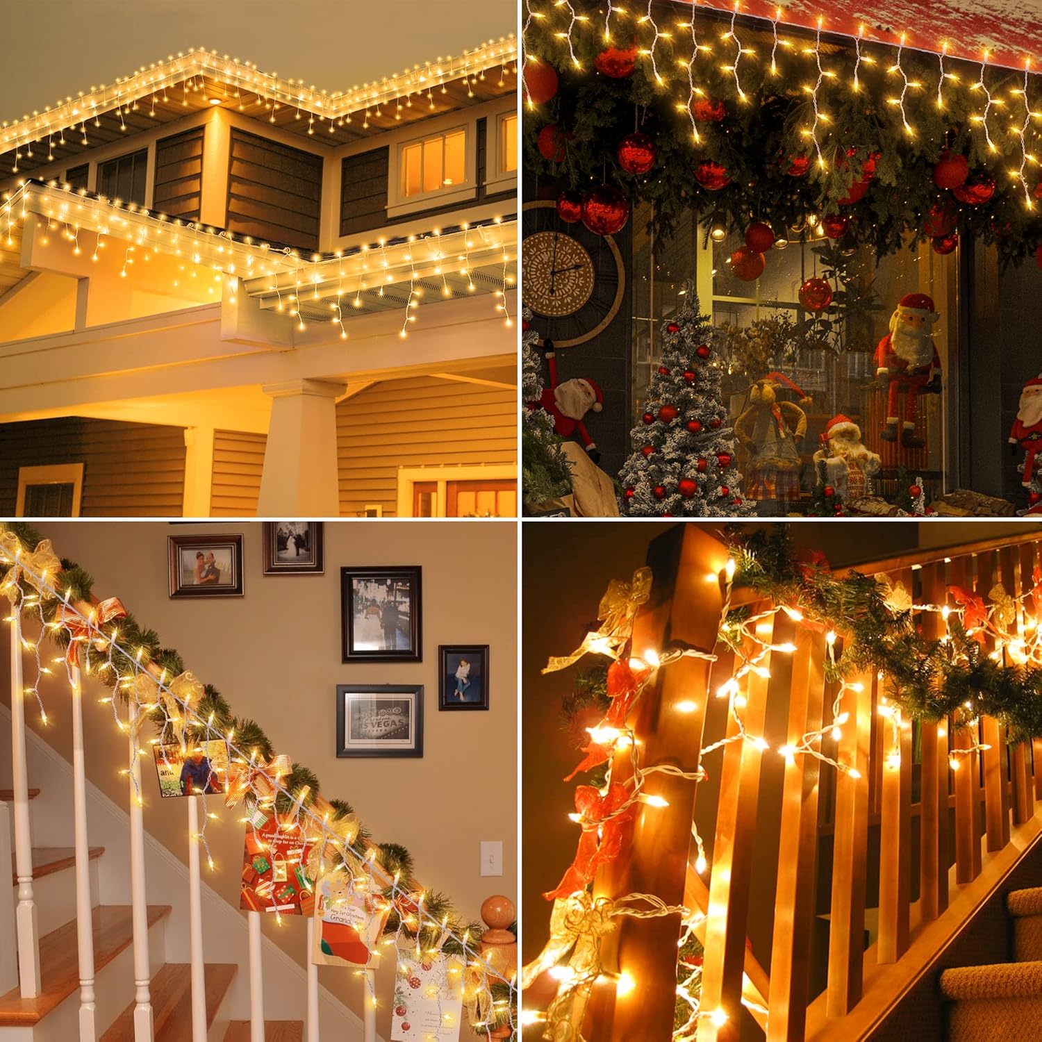 - ⛄*Easy to Install & Cable Tie*-Hang the icicle lights outdoor on the eaves,patio,garage,top of hall,handrail,wedding,or anywhere you want. Directly plug in and unplug it for power on and off. And each string of lights is equipped with 25 cable ties,very easy and convenient to install or place it anywhere as you like, do it by yourself and enjoy the fun!