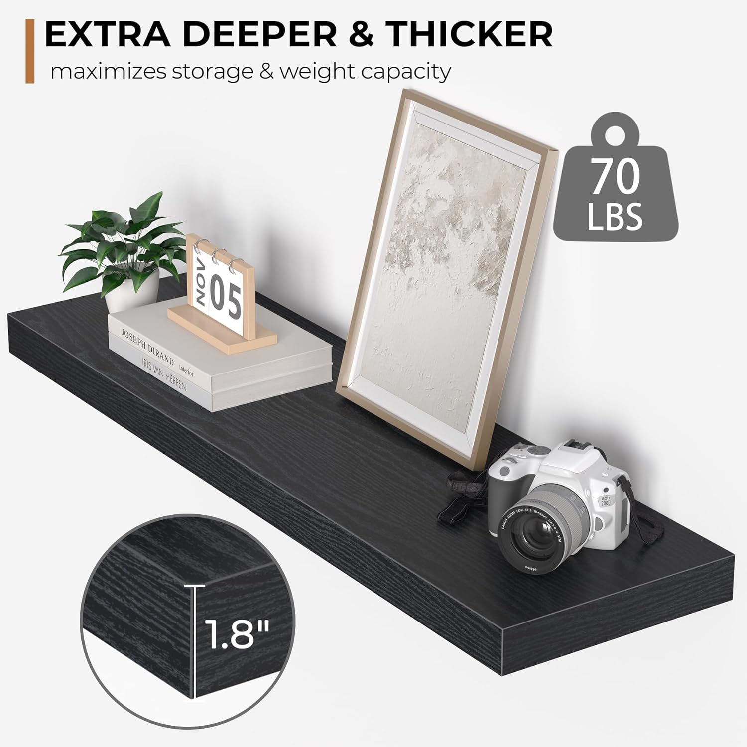 - Extra Deeper & Thicker - This wall shelf measures 36"W x 10.23"D x 1.8"H. Extra deeper and thicker design in order to bring maximizes storage space and weight capacity, even hold up to 70 lb. This floating shelf taking up zero square feet, reduces clutter and highlights décor in compact spaces.