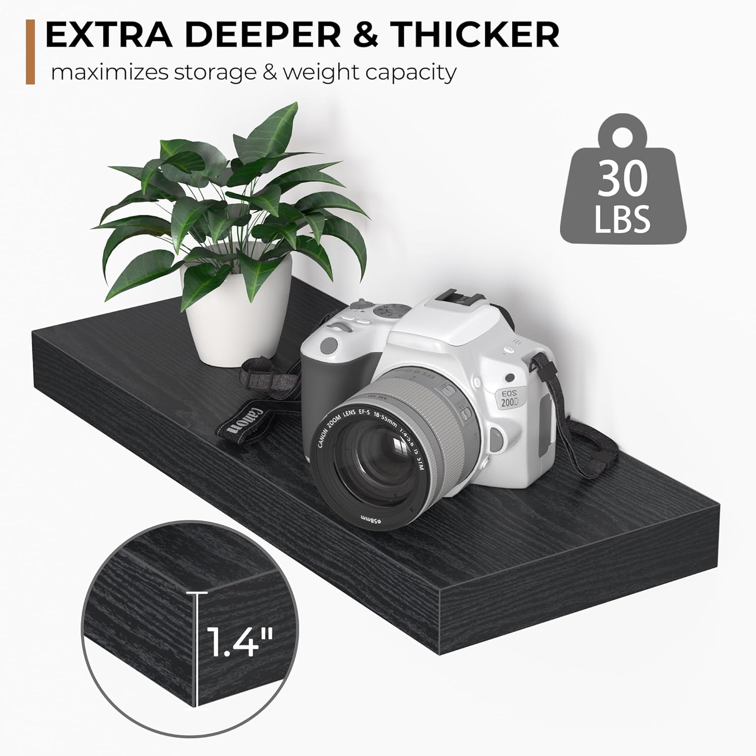 - Extra Deeper & Thicker - Each board measures 16"W x 6.7"D x 1.4"H. Extra deeper and thicker design in order to bring maximizes storage space and weight capacity, even hold up to 30 lb each. This floating shelf taking up zero square feet, reduces clutter and highlights décor in compact spaces.