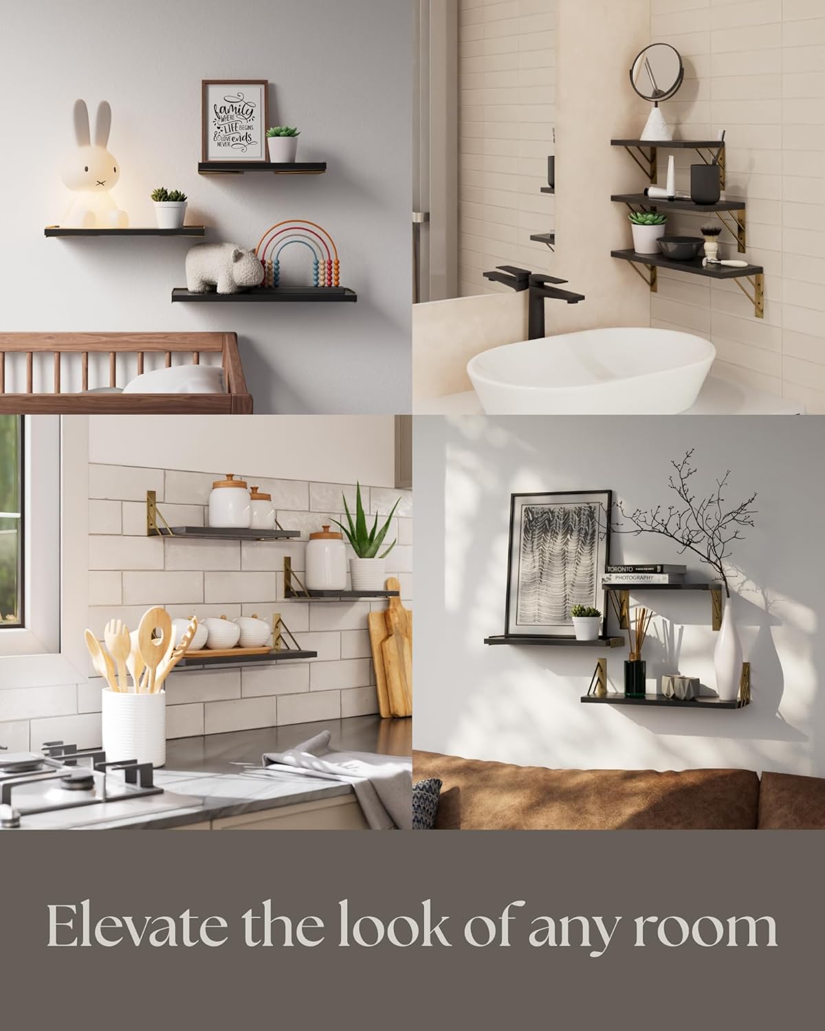 - Three floating shelves made of solid Paulownia wood and metal brackets allow flexible layout and decor options for any room