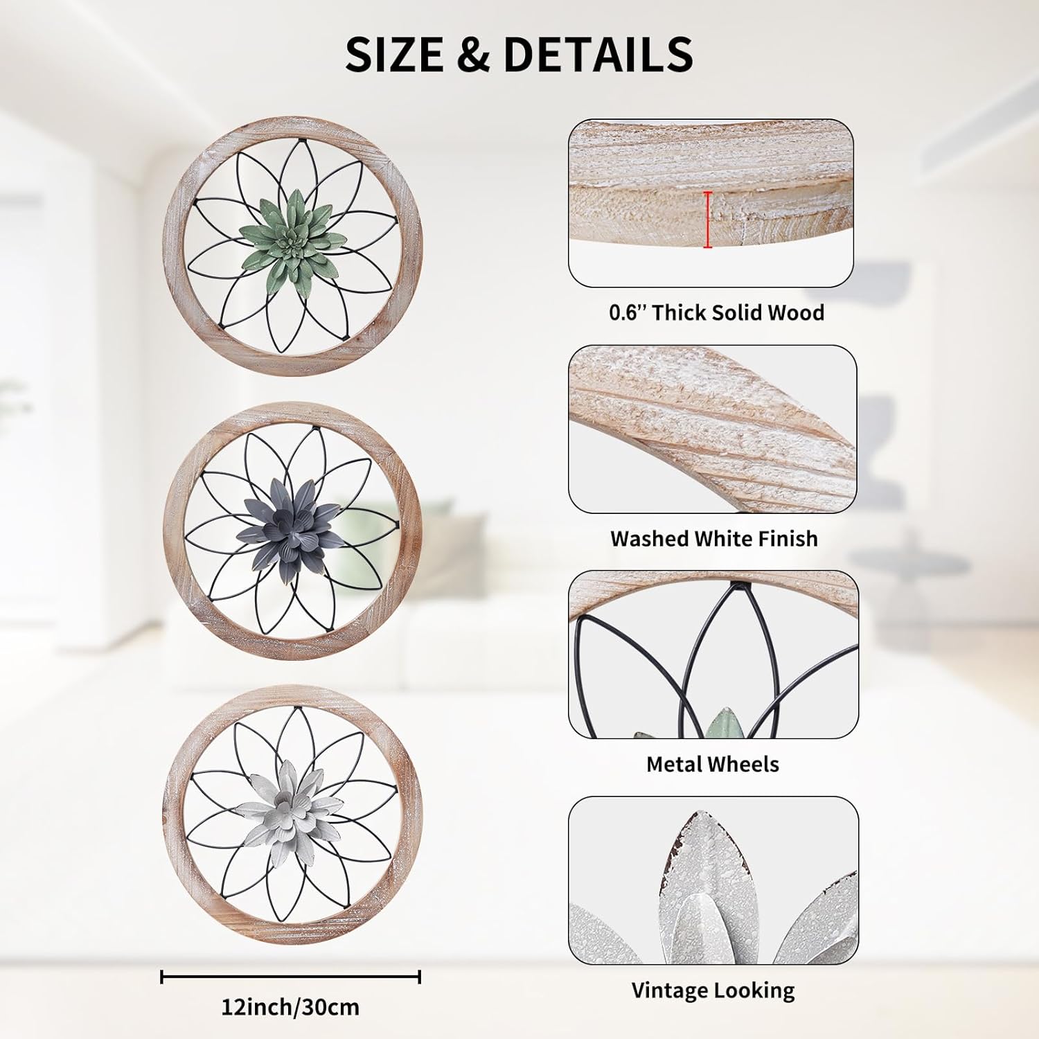 • FARMHOUSE WALL DECOR -- These 3 pcs round kitchen wall decor made of fir wood frame and metal wheels, come with 6 replaceable metal flowers, the rustic style is perfect for both modern or farmhouse home decor