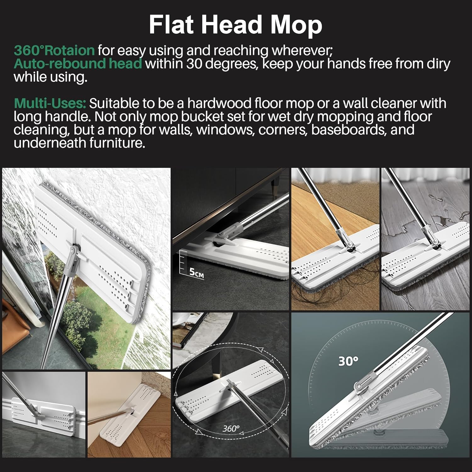 JOYMOOP Mop and Bucket with Wringer Set, White Flat Squeeze Mop Bucket Set for Floor Cleaning, Wet Dry Mop for Walls, Wall Cleaner with Long Handle, Hardwood Floor Mop-5 Microfiber Cloths
