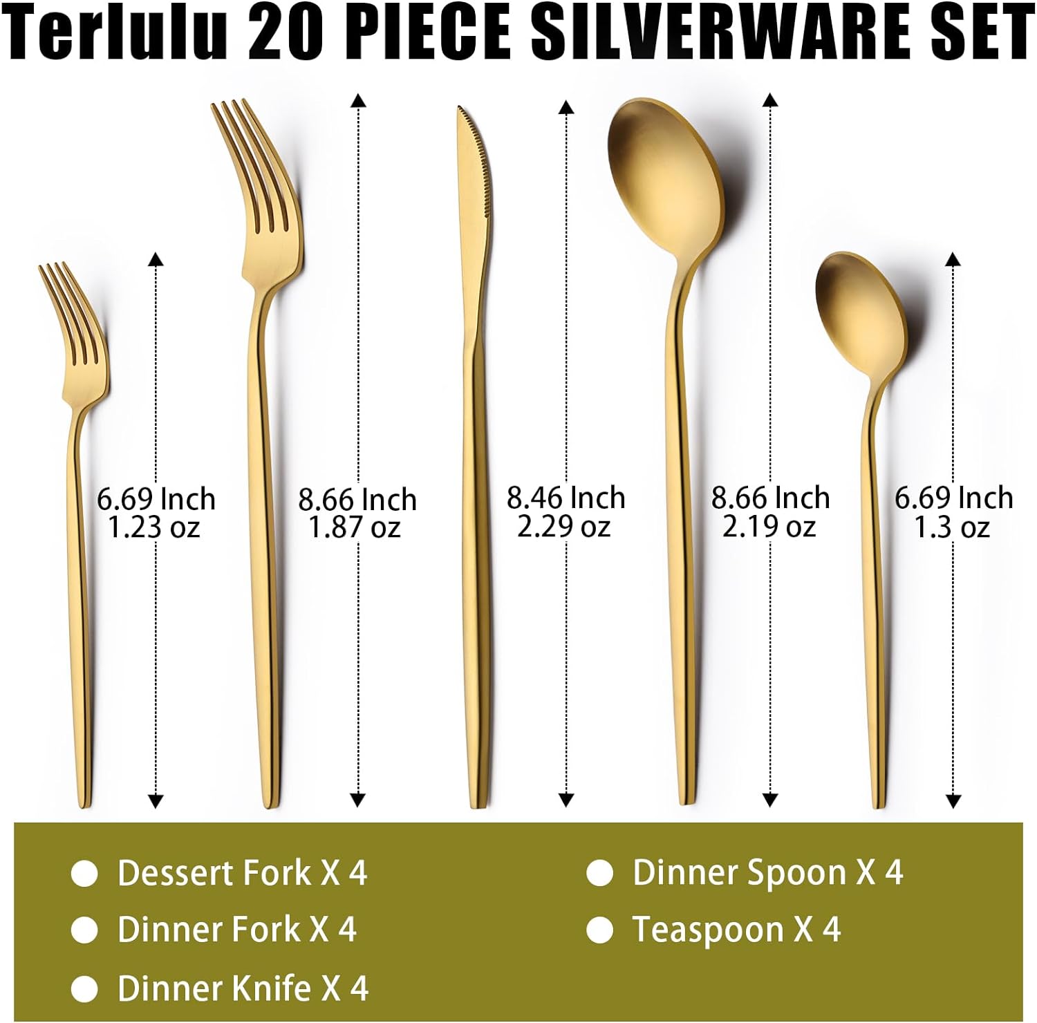 - 【SERVICE FOR 4】 Terlulu 20 piece gold silverware set for 4 includes 4 dinner forks, 4 dinner spoons, 4 dinner knives, 4 teaspoons, 4 salad/dessert forks in normal size, perfect for most families.