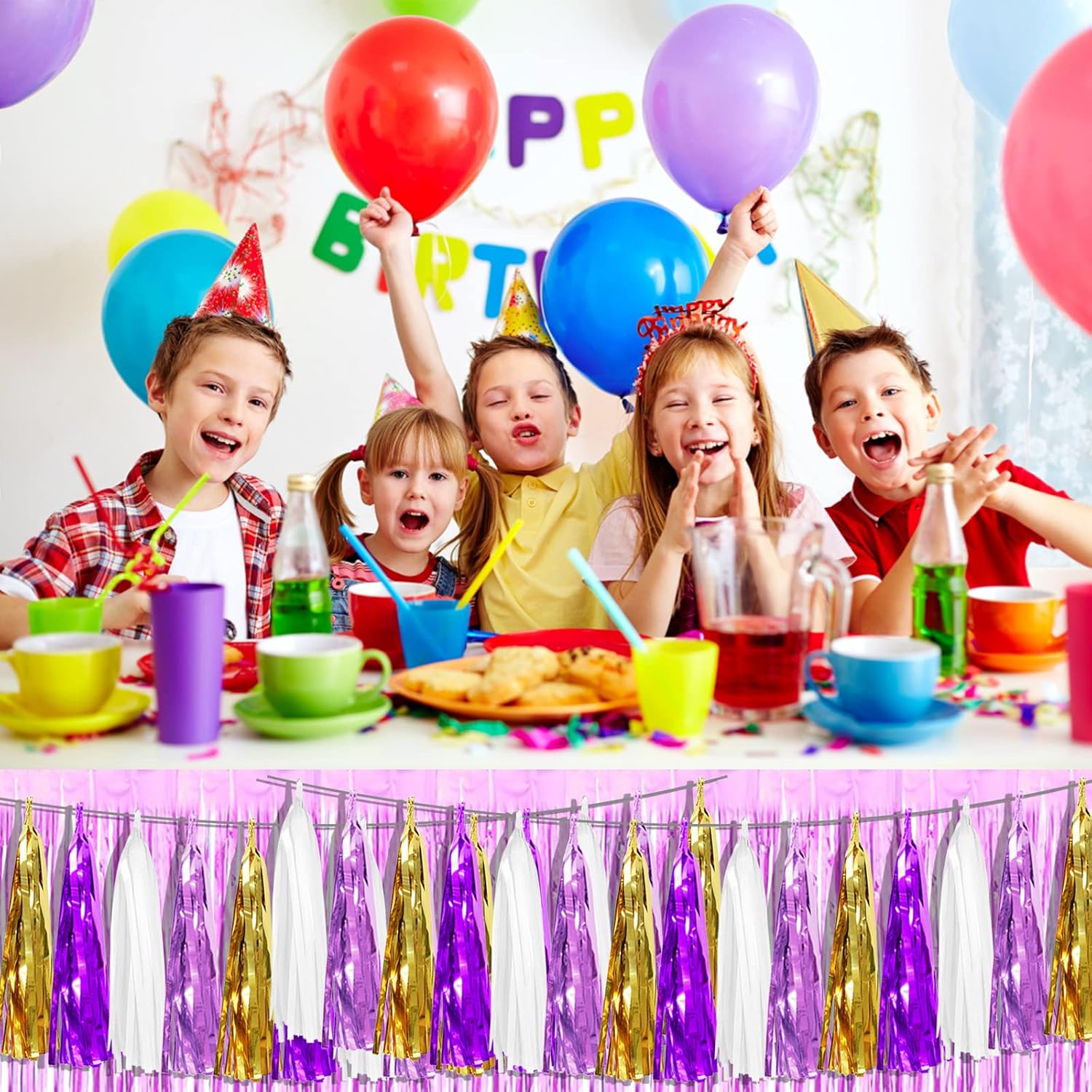 - 【White Light Purple Purple Gold Party Supplies Set】: The total length of the white light purple purple gold birthday tassels banner is 26.2 feet, divided into 4 strips, each 6.5 feet long. Each banner contains 15 tassels, and each tassel measures 14 inches, for birthday decorations many occasions, and so on