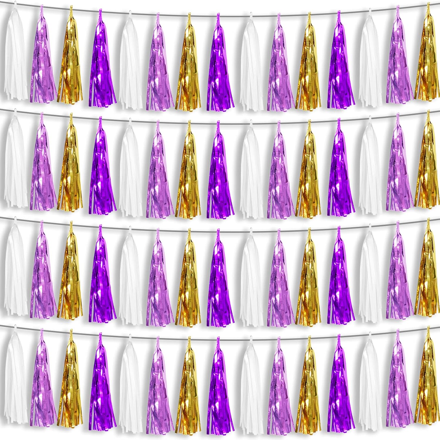 - 【Perfect Party Decoration】The white light purple purple gold tinsel garlands are designed in a metallic Fringe, bright, and beautiful, at the same time, they shine in the sun, and these gorgeous tassel garlands create a wonderful backdrop or centerpiece for your party space. and bring you, your family, and your friend's good Visual effects. your party many emotional and touching moments where a lot of pictures will be taken and everybody will have a wonderful time together.