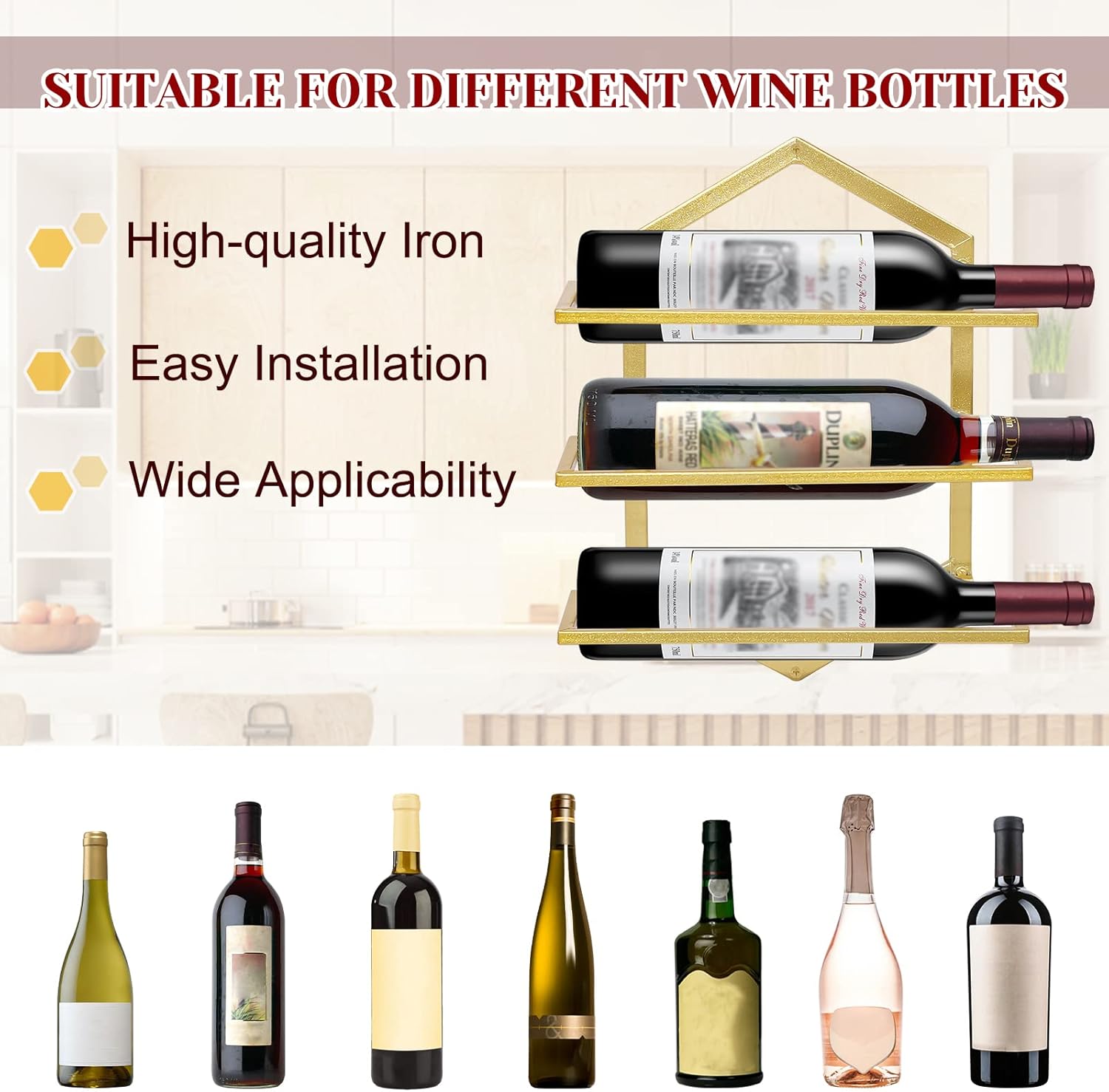 2Pcs Wall Mounted Wine Stemware Rack, Metal Hanging Wine Glass Display Holde Holds 3 Bottles, Elegant Storage for Kitchen Dining Room Bar Wine Cellar (Gold)