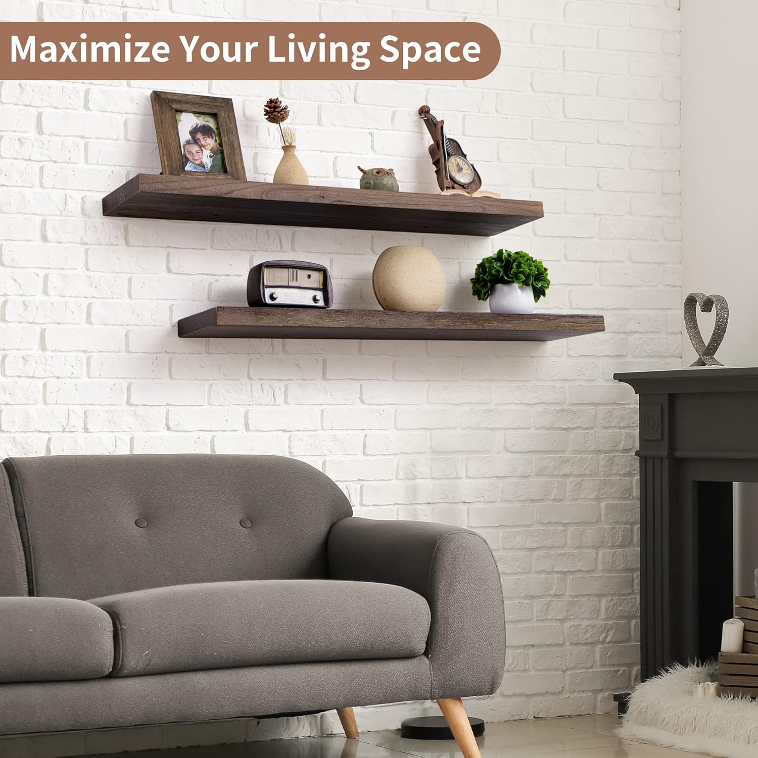 Axeman Floating Shelves for Wall, 8 Inch Deep Rustic Solid Elm Wood Wall Shelves for Storage, Wall Mounted Display Shelving with Invisible Heavy-Duty Metal Bracket, 36'' Width Set of 2, Walnut