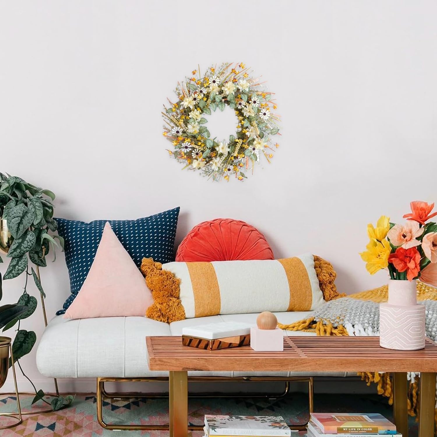 - Perfect Size:Artificial spring summer wreath with 20 inch outer diameter. This spring summer wreath has a full mix of beautifully arranged and mixed element for your enjoyment ,and they will never wither and fall.