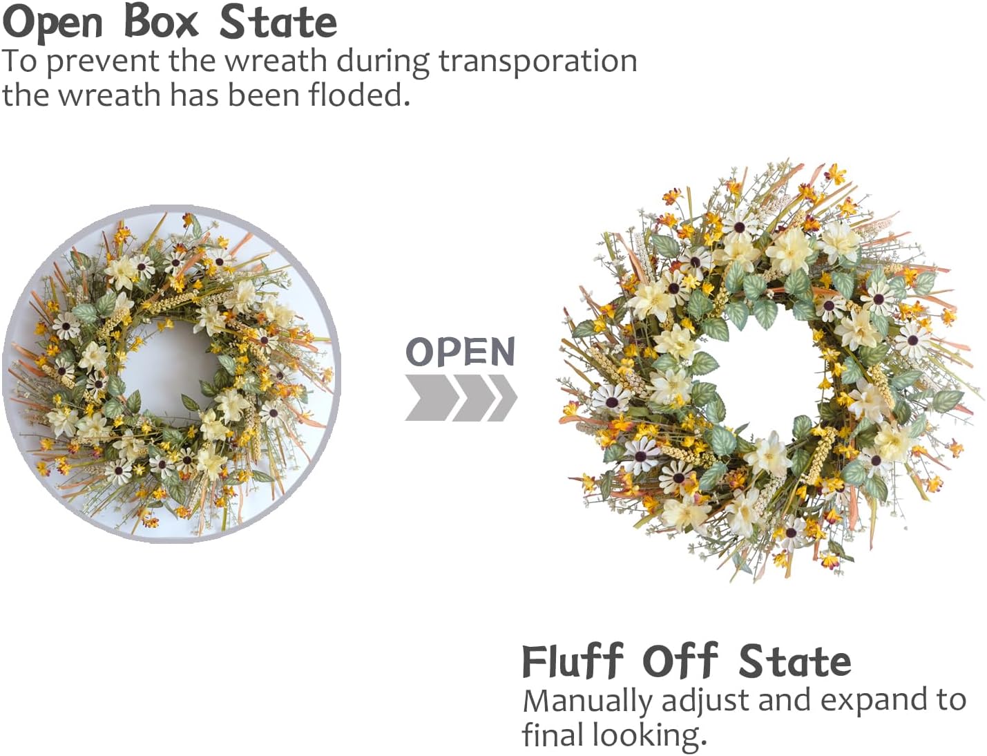 - This spring summer wreath contains a variety of decorations, such as yellow and white daisies, ear of wheat, green leaves and so on.The vibrant and full-bodied daisies as ornaments make this wreath even more lively and vibrant. In addition, the thick wreath base is made of natural rattan rings, which is not easy to be deformed and damaged, and it feels very real. The overall shape is very full, making it the best choice for spring summer.