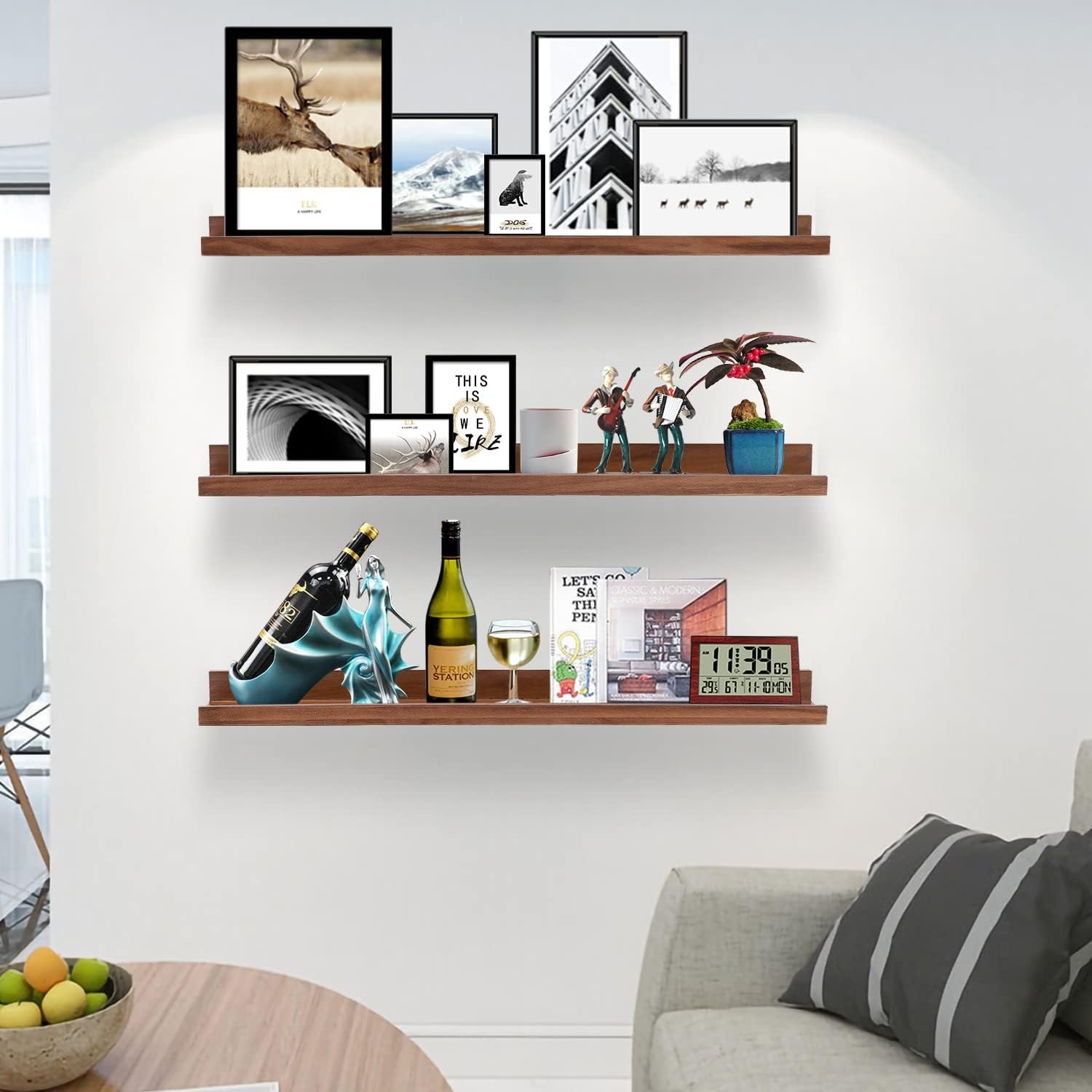 AZSKY Floating Photo Shelves Fair Light Walnut 24 Inch Picture Ledge for Storage Wall Book Shelves Hanging Picture Photo Frame Ledge Shelves with Lip a Set of 3 Same Sizes Kitchen Spice Rack
