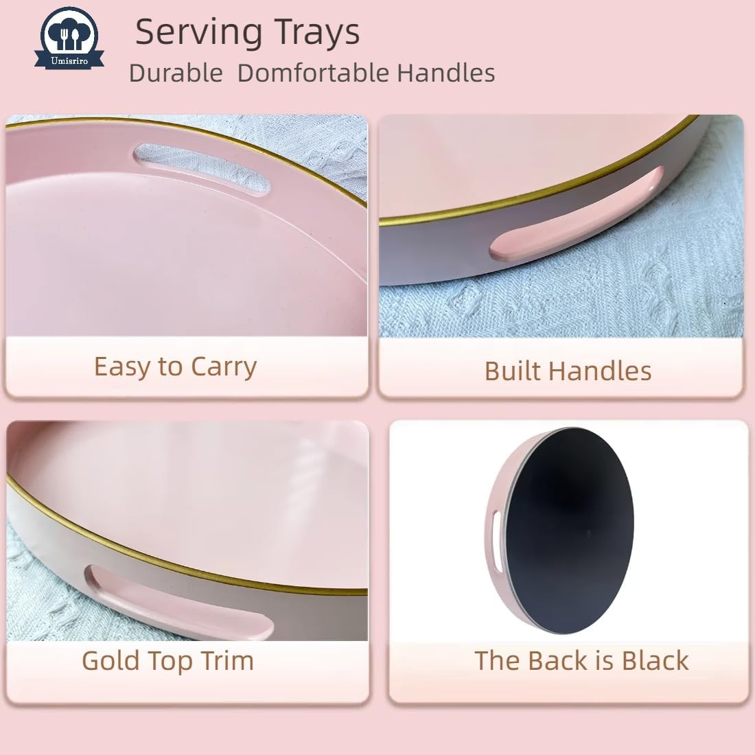 13" Pink Serving Tray with Handles,Round Decorative Tray for Coffee Table, Plastic Modern Coffee Table Tray for Ottoman, Living Room, Bathroom, Décor.
