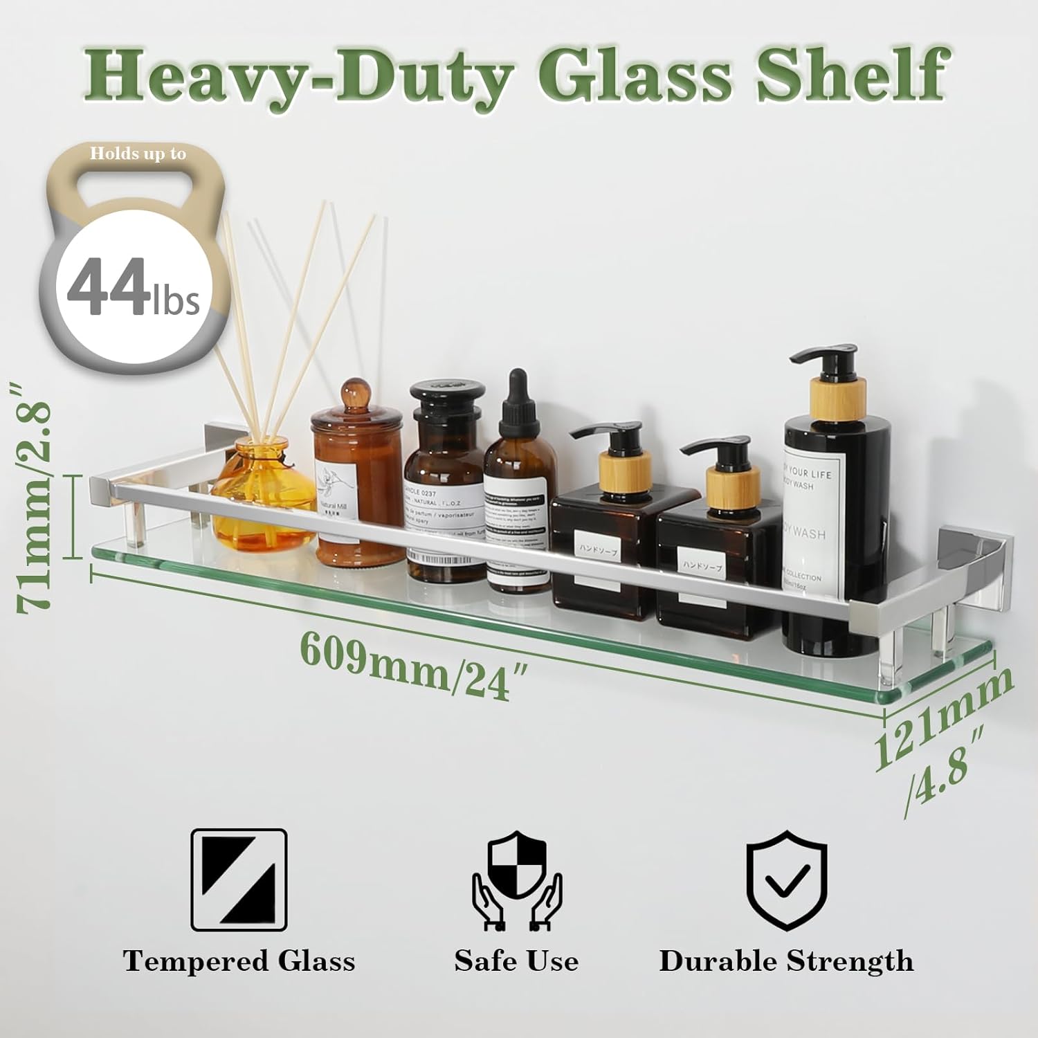 - VERSATILE INSTALLATION:These glass shelving is easy to install with included hardware, suitable for a variety of settings including bathrooms, kitchens, and living rooms