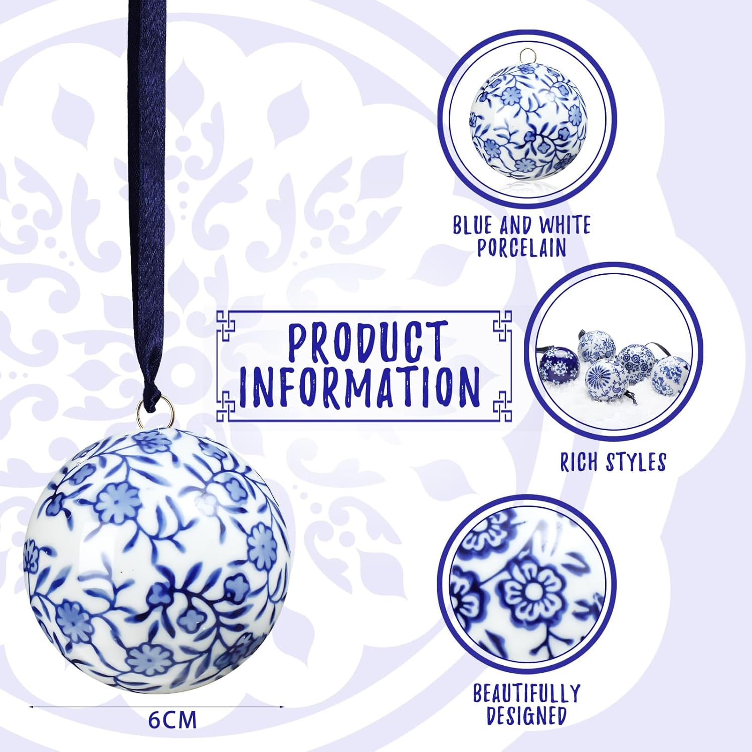 - 6 Pcs Porcelain Orbs: the set of decorative porcelain balls ornaments has a total of 6 pieces of balls in 6 different patterns and styles, each with a size of 2.4 inches/ 6 cm in diameter; The sufficient quantity and the rich styles can meet your use and share needs in daily life or other festivals