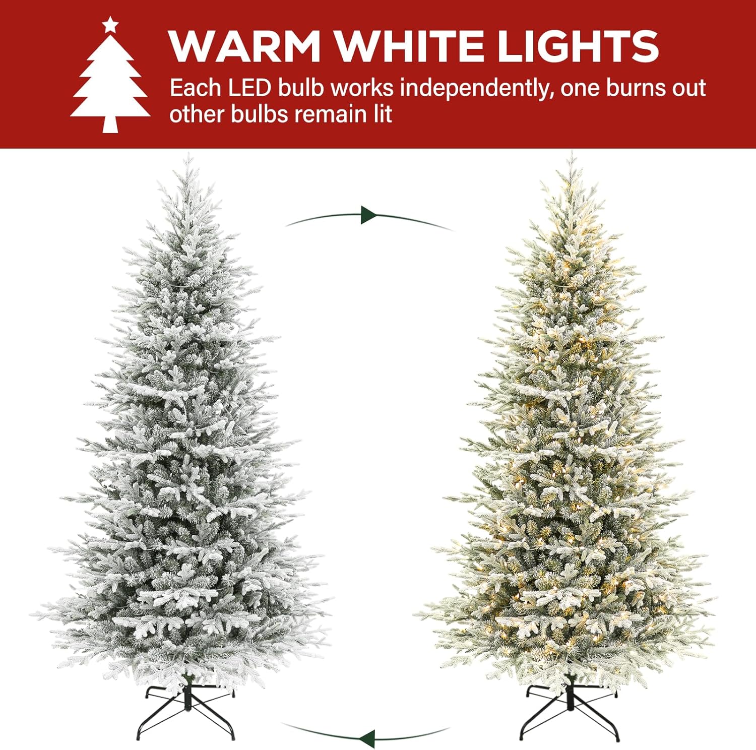 Hykolity 7.5 ft Prelit Snow Flocked Christmas Tree, 2933 PE&PVC Realistic Branch Tips, Artificial Twinkling Christmas Tree with 450 Warm White LED Lights, Metal Stand and Hinged Branches
