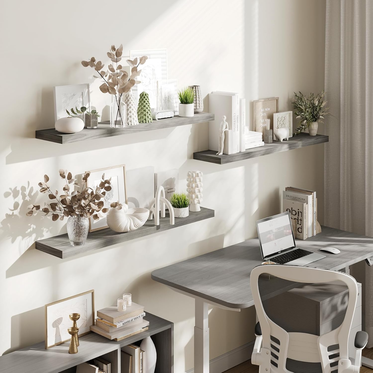 - GREAT FOR ANY ROOM: Our wood floating shelves are made of MDF with a frosted surface texture for a mordern feel that blends perfectly into a variety of different scenes; Having this large floating shelf not only for its decoration effect, but also for its high practicality; It can be used for organizing all household rooms, such as bedroom, living room, study, toilet, cloakroom, even kitchen and warehouse