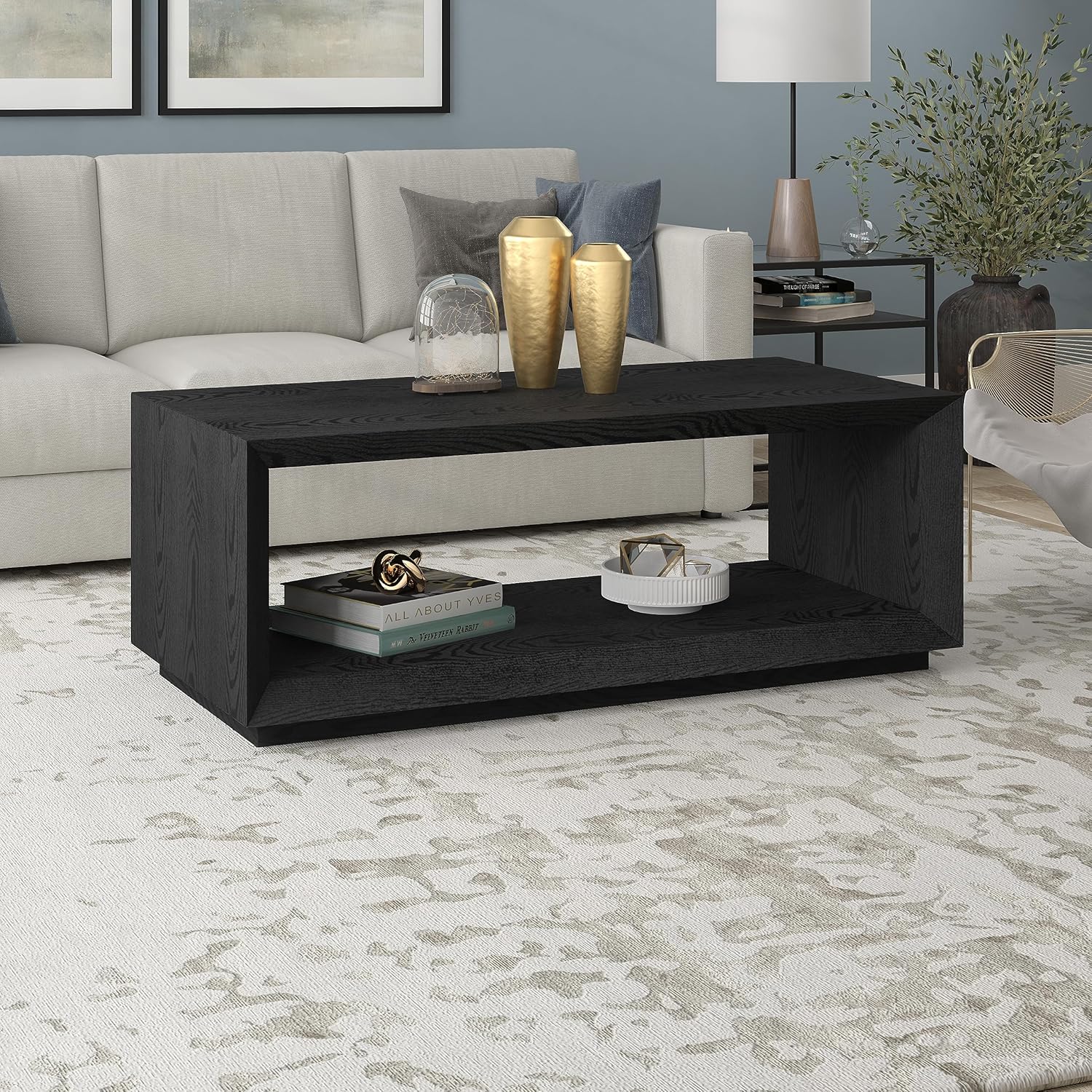 Henn&Hart 48" Rectangular Coffee Table with Open Storage Shelf for Living Room, Family Room, or Office, Black Grain