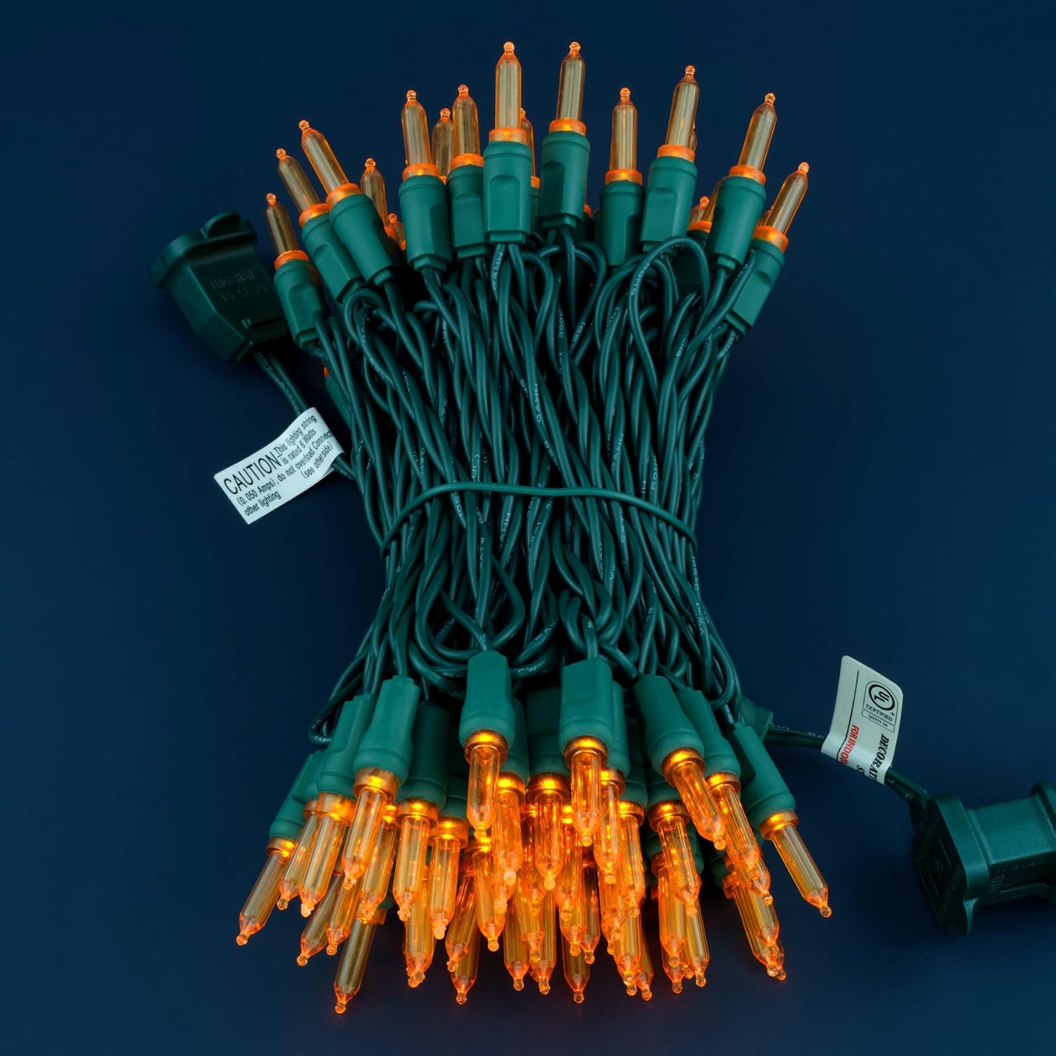 - SPECIFICATIONS ☀ Each pack contains 1 strands of one-piece string lights, total length 33 feet with 100 count orange mini lights. 22 AWG green cord, 4" lead, 4" spacing, 4" tail.