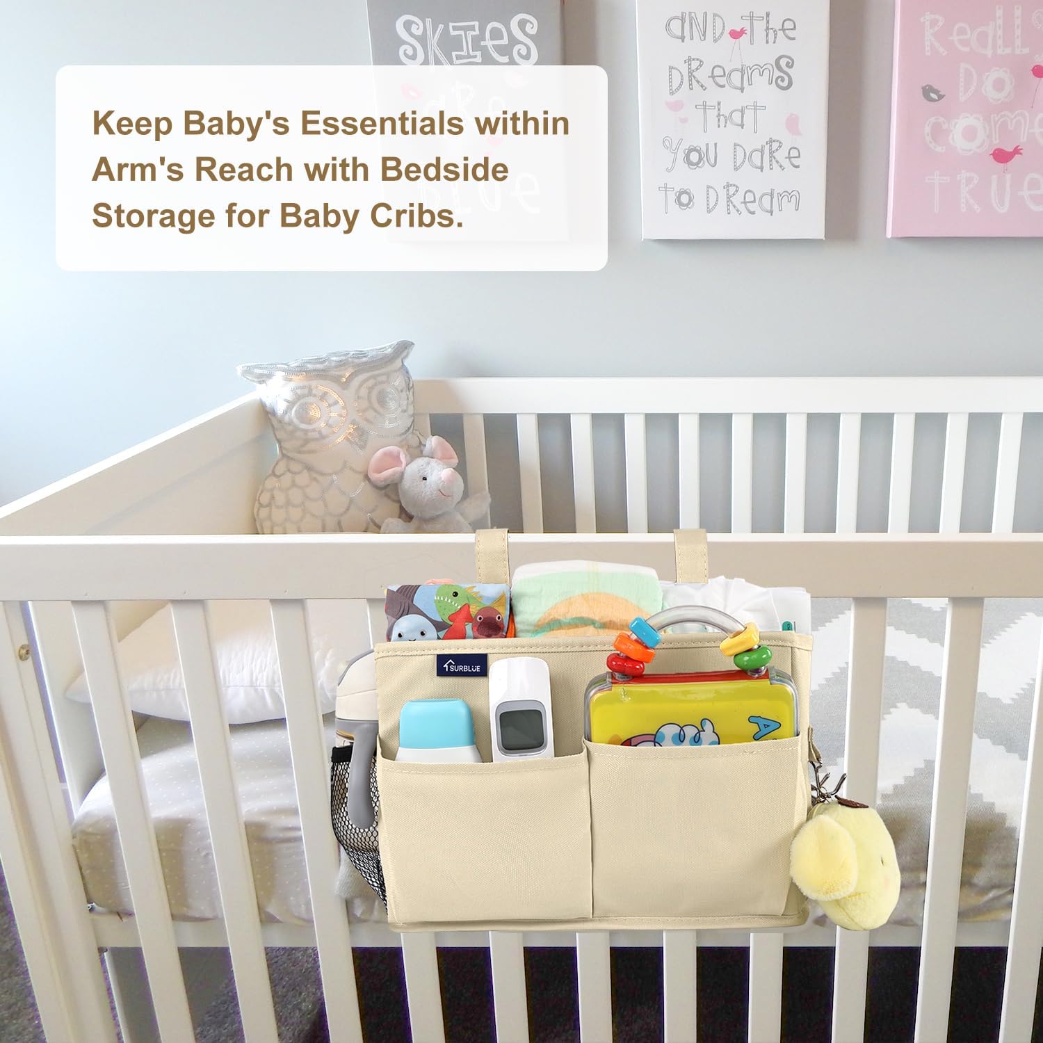 - Multi-Purpose: The bedside organizer is suitable for kid beds, top bunk beds, chair arms, and baby strollers, a good choice for RV, home, hospital, living room, or college dorm.