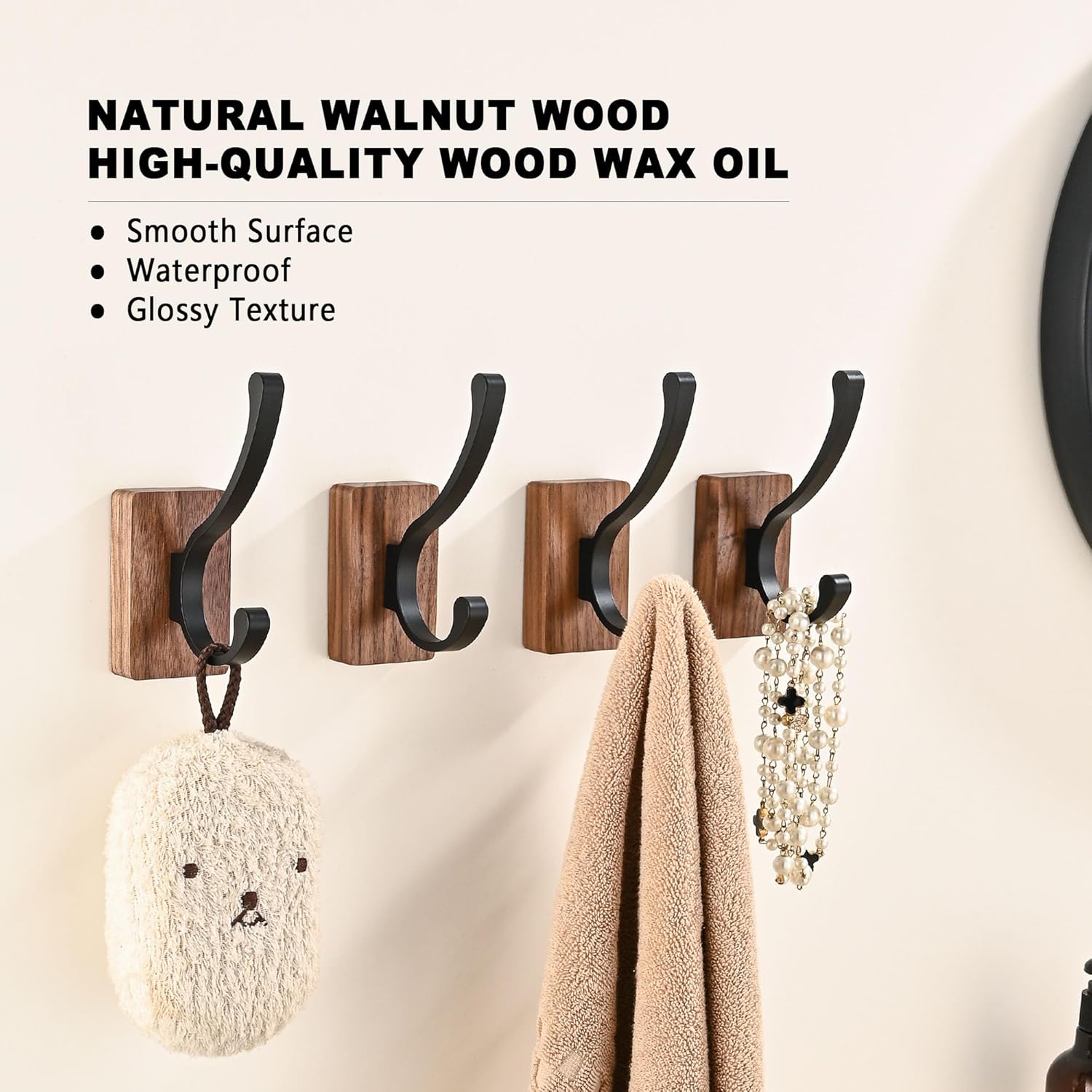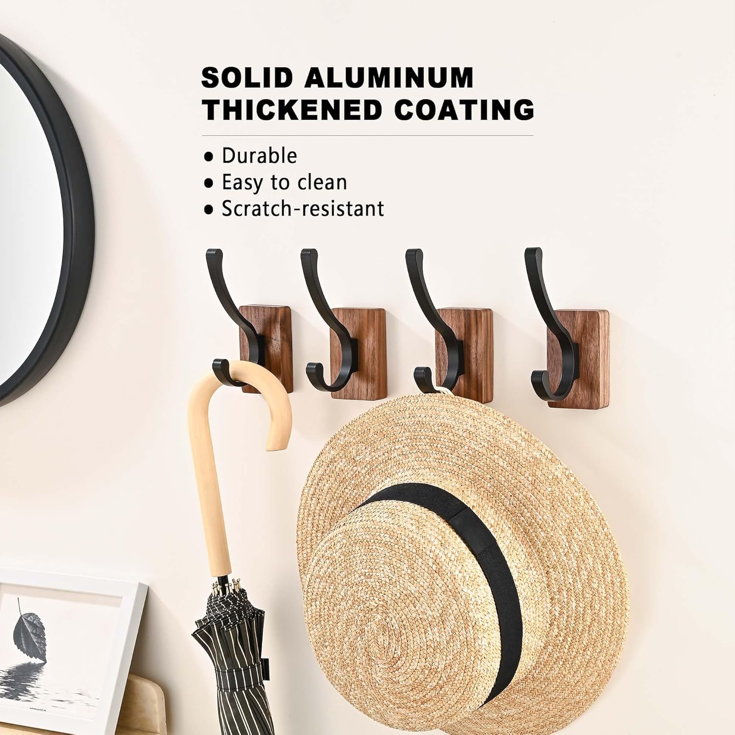 - [Durable and Sturdy]: Our hooks are made of thick and durable aluminum alloy, which is solid and sturdy. The hooks are also designed to withstand wear and tear, ensuring long-lasting performance. The base is a solid, natural North American Black Walnut Wood.
