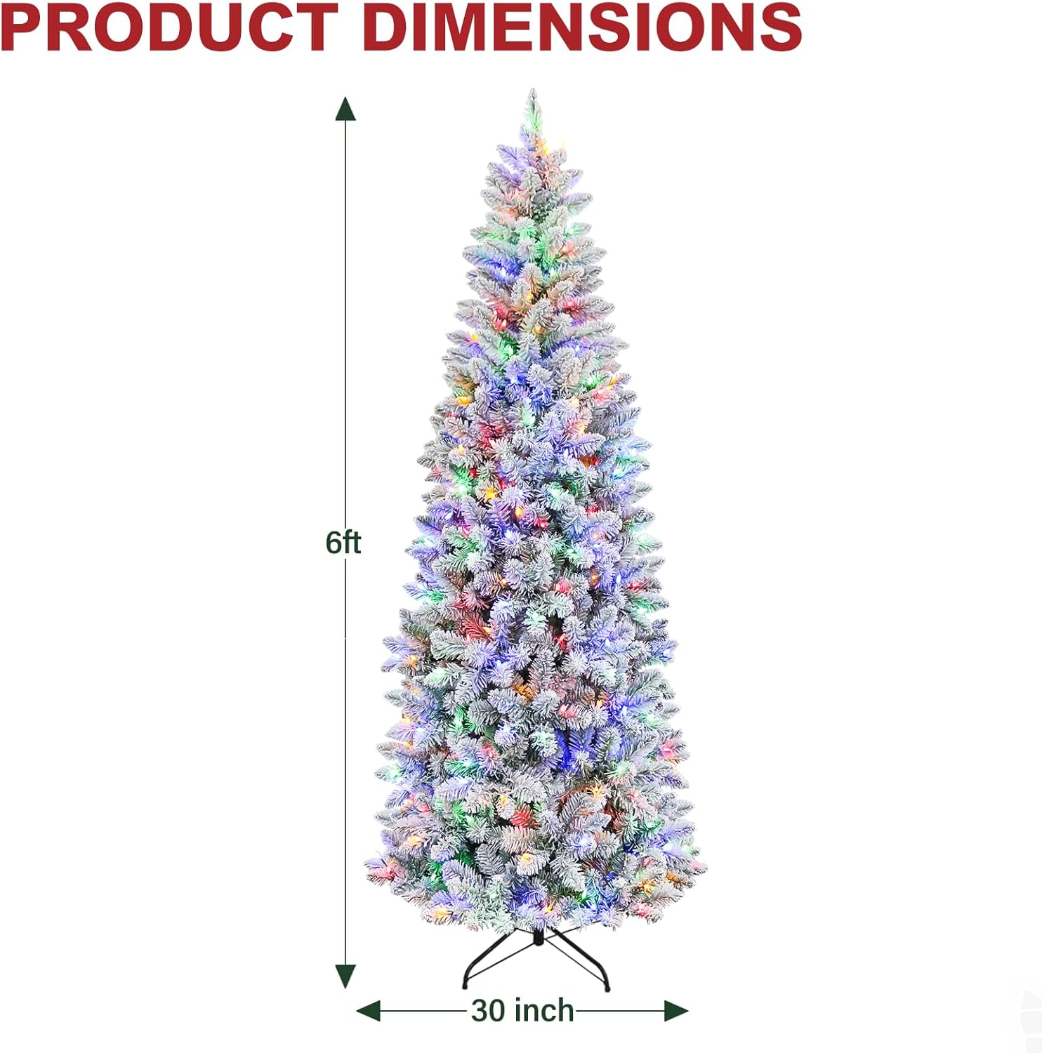 Hykolity 6 ft Prelit Snow Flocked Pencil Slim Christmas Tree, 544 PVC Branch Tips, 200 Color Changing LED Lights, Metal Stand and Hinged Branches, 10 Color Modes