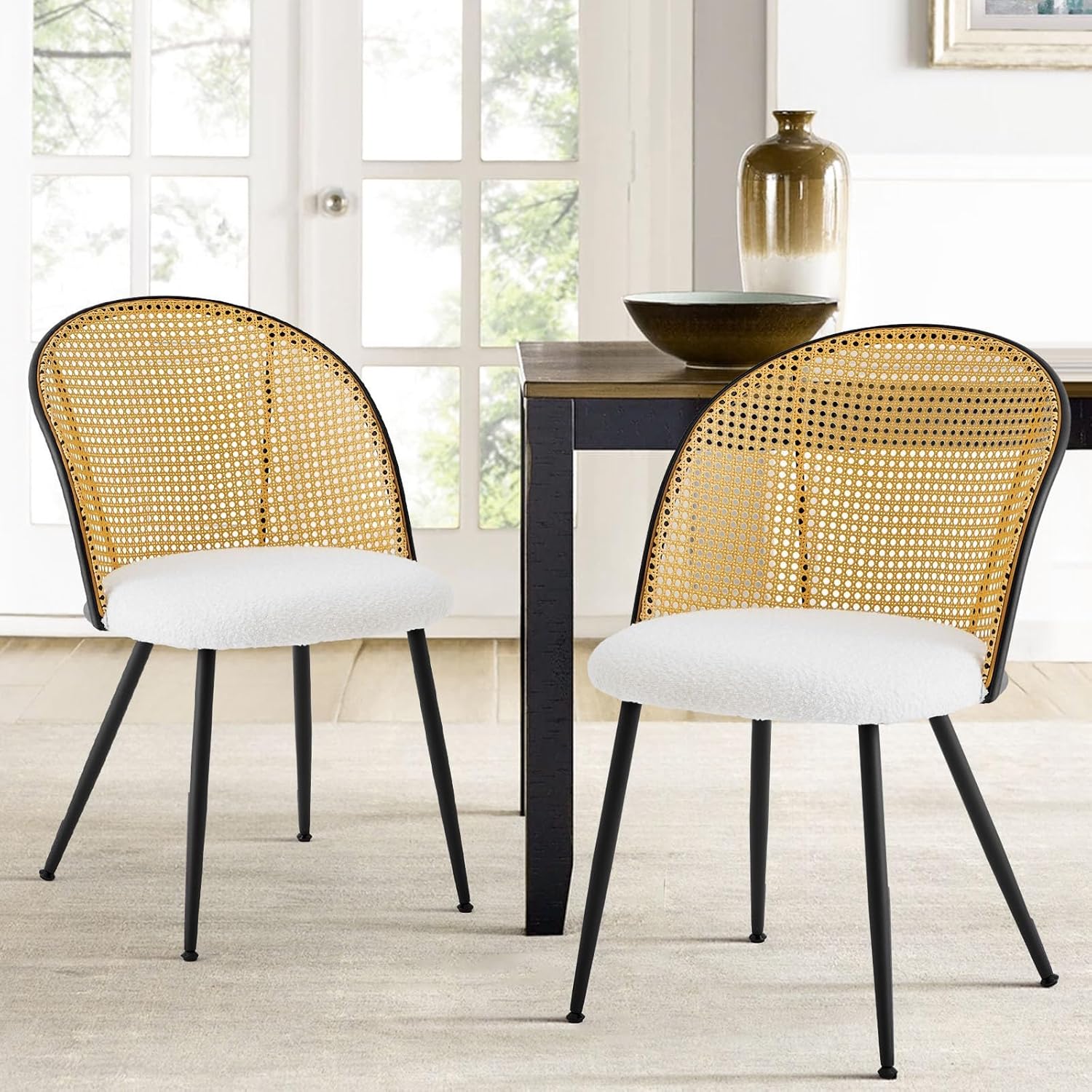 Rattan Dining Chairs Set of 2, Mid-Century Modern Kitchen Dining Room Chairs with Full Cane Backrest Armless Upholstered Farmhouse Boucle Dining Chairs with Metal Leqs for Dining Room, White