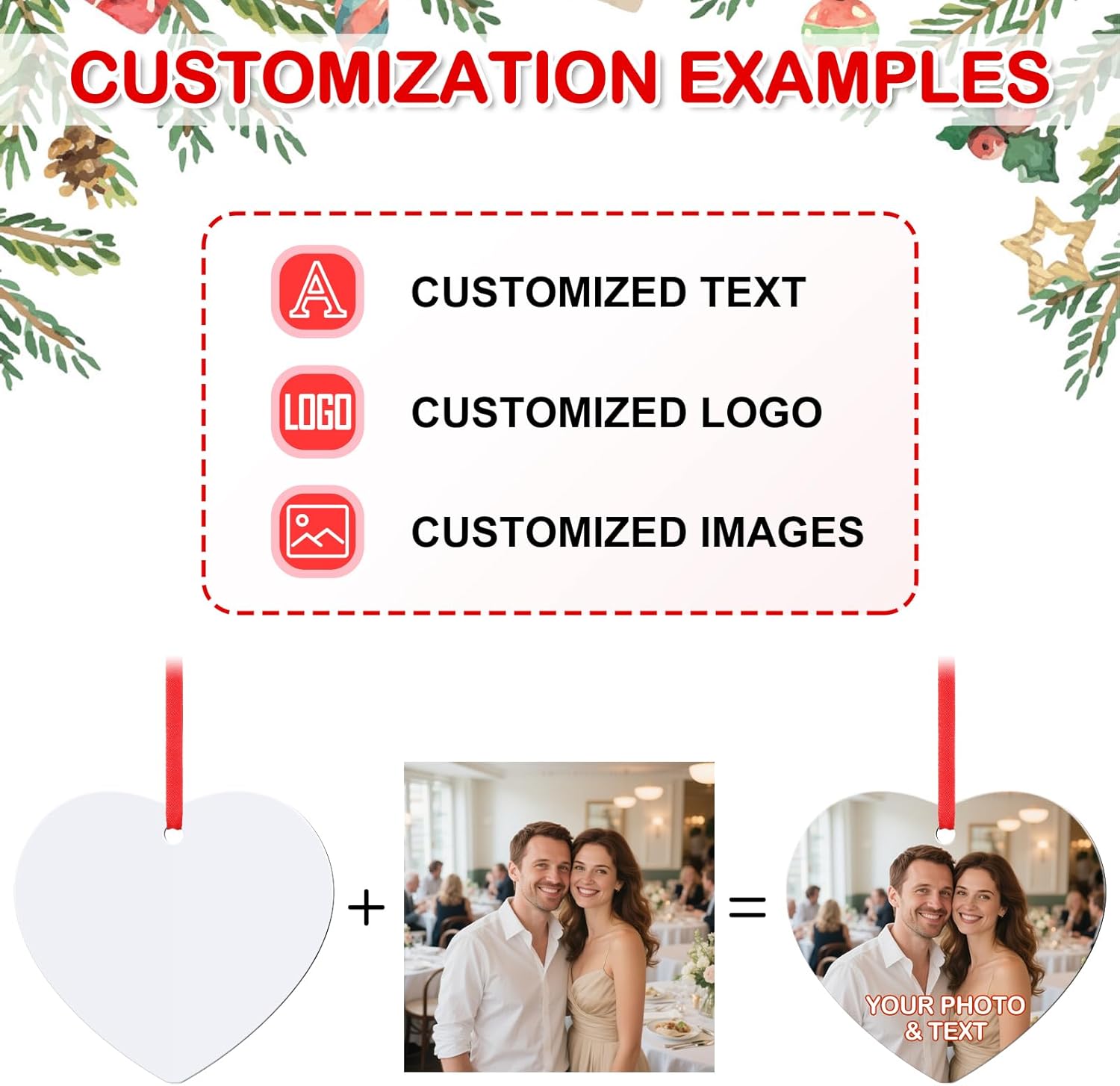 • CUSTOM CHRISTMAS ORNAMENTS 2024 - Click "Customize Now" to start personalize your own ornament special with desired photo, words, text, logo, image, saying, number, name etc. You can customize several ornaments to send to all your loved ones. Imagine how surprised they will be when they receive the personalized gifts.