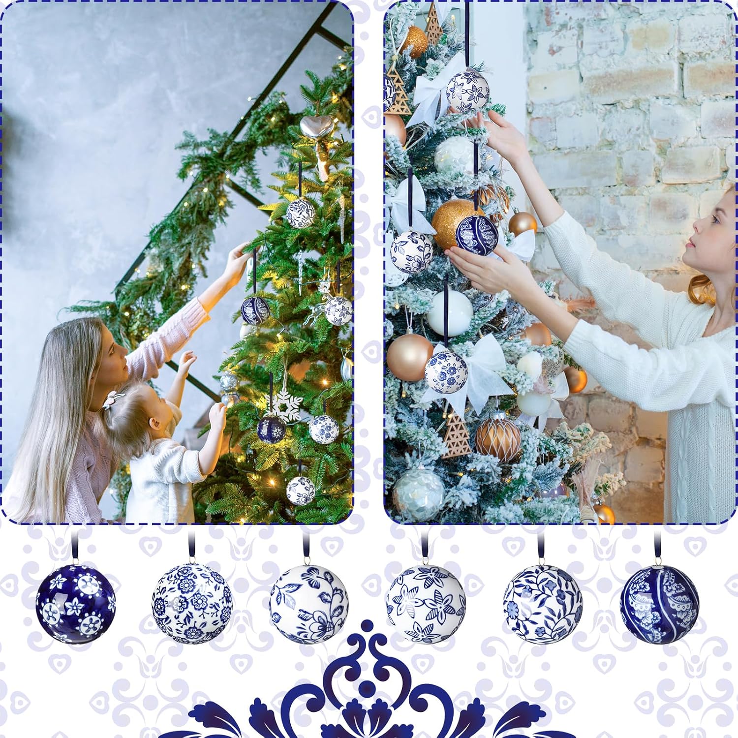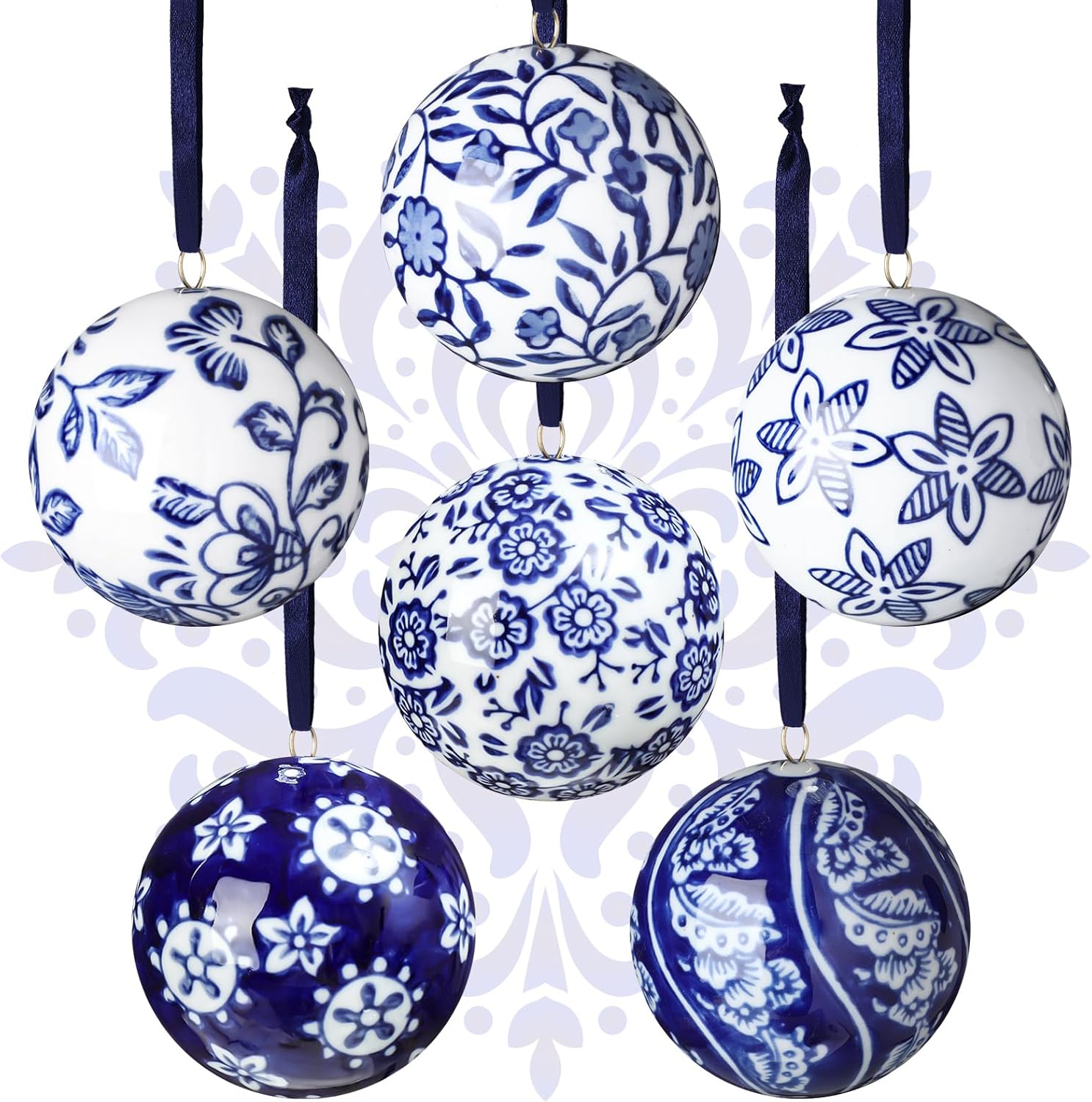 Cindeer 6 Pcs Blue and White Christmas Porcelain Balls 2.4 Inch Porcelain Chinoiserie Ornament Bulk Christmas Ceramic Hanging Decorative for Tree Home Xmas Party (Novelty Style)