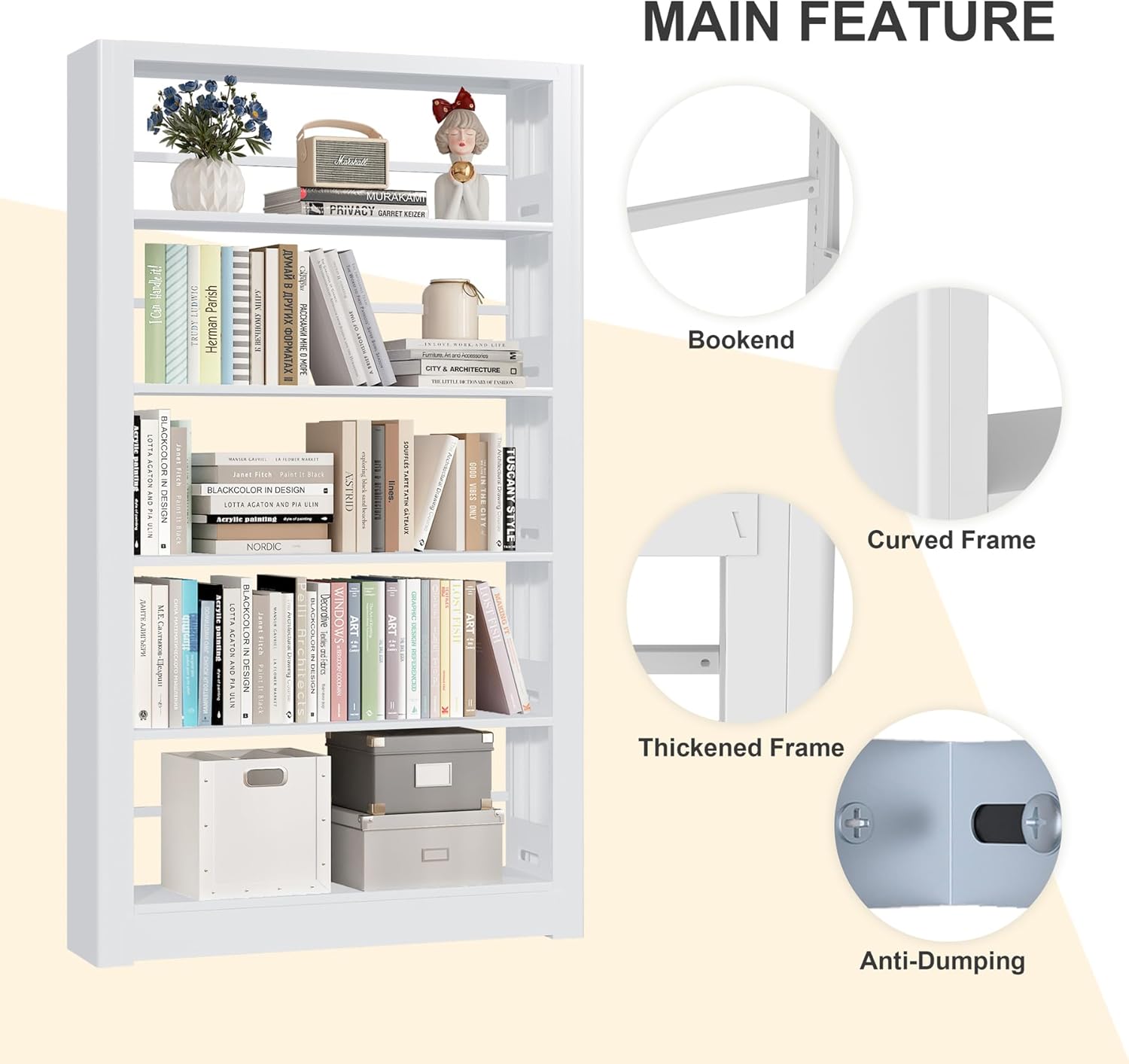 - 【Safe and Secure for any space】Modern bookshelves and bookcases is designed for library, office, living room. Industrial bookshelves has rounded corners on both sides and an anti-tipping design on the back to prevent bumping, making it safer for home use. The surface of the white bookshelf is made of high quality powder coating process, very easy to clean, no formaldehyde, no odor, suitable for use as home and school shelves.