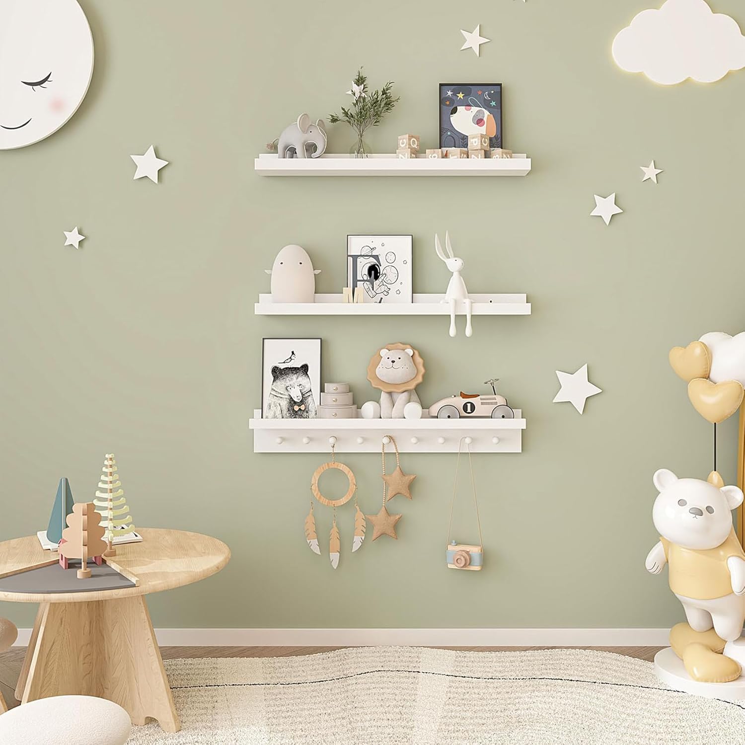 MBYD White Floating Shelves for Wall with Hooks, Nursery Book Shelves for Kids Room, 36 Inch Wall Mount Bookshelf for Living Room Bedroom Bathroom Kitchen, Hanging Picture Ledge Shelf Set of 3
