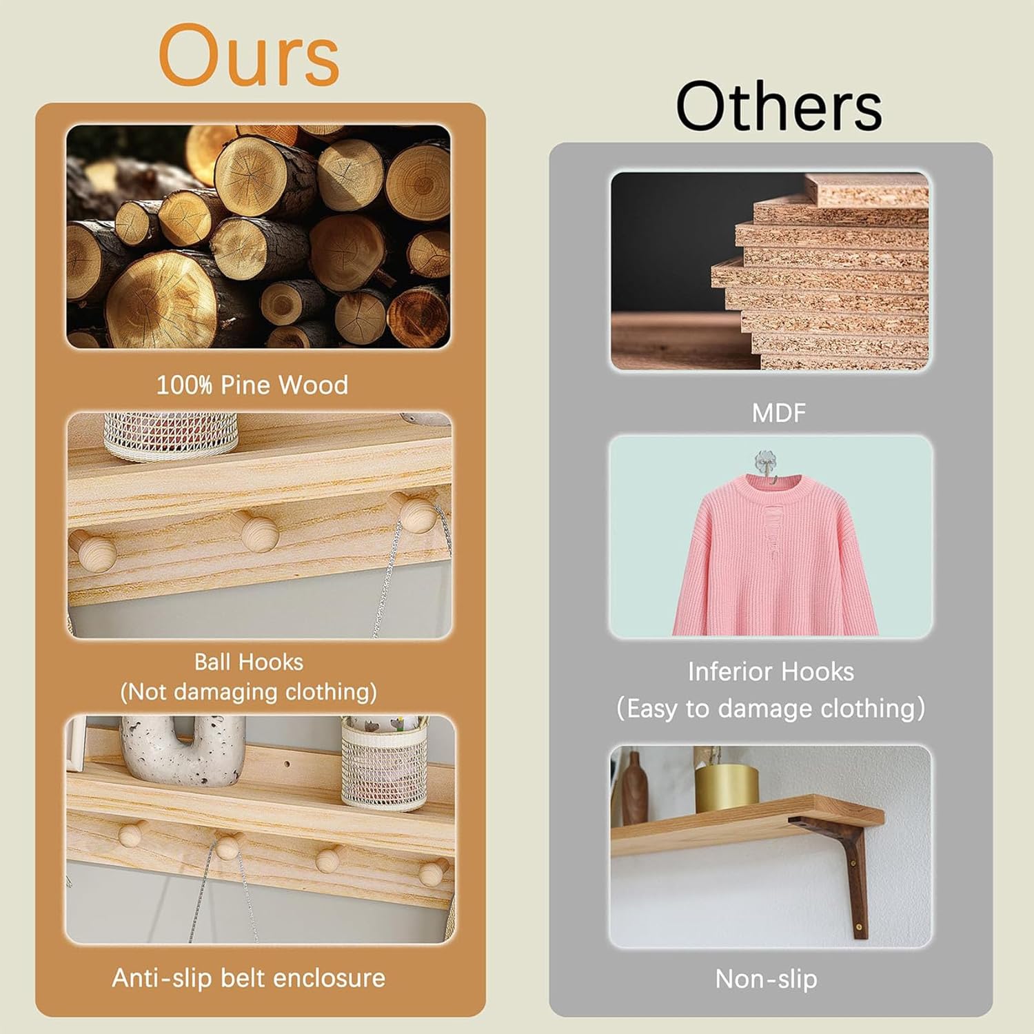 - 100% Pine Wood: Floating shelves with natural hooks are crafted from quality wood to ensure excellent durability. Solid wood floating shelves are carefully selected to guarantee a beautiful appearance while withstanding weight and pressure, and large floating shelf with lip provide more storage space.