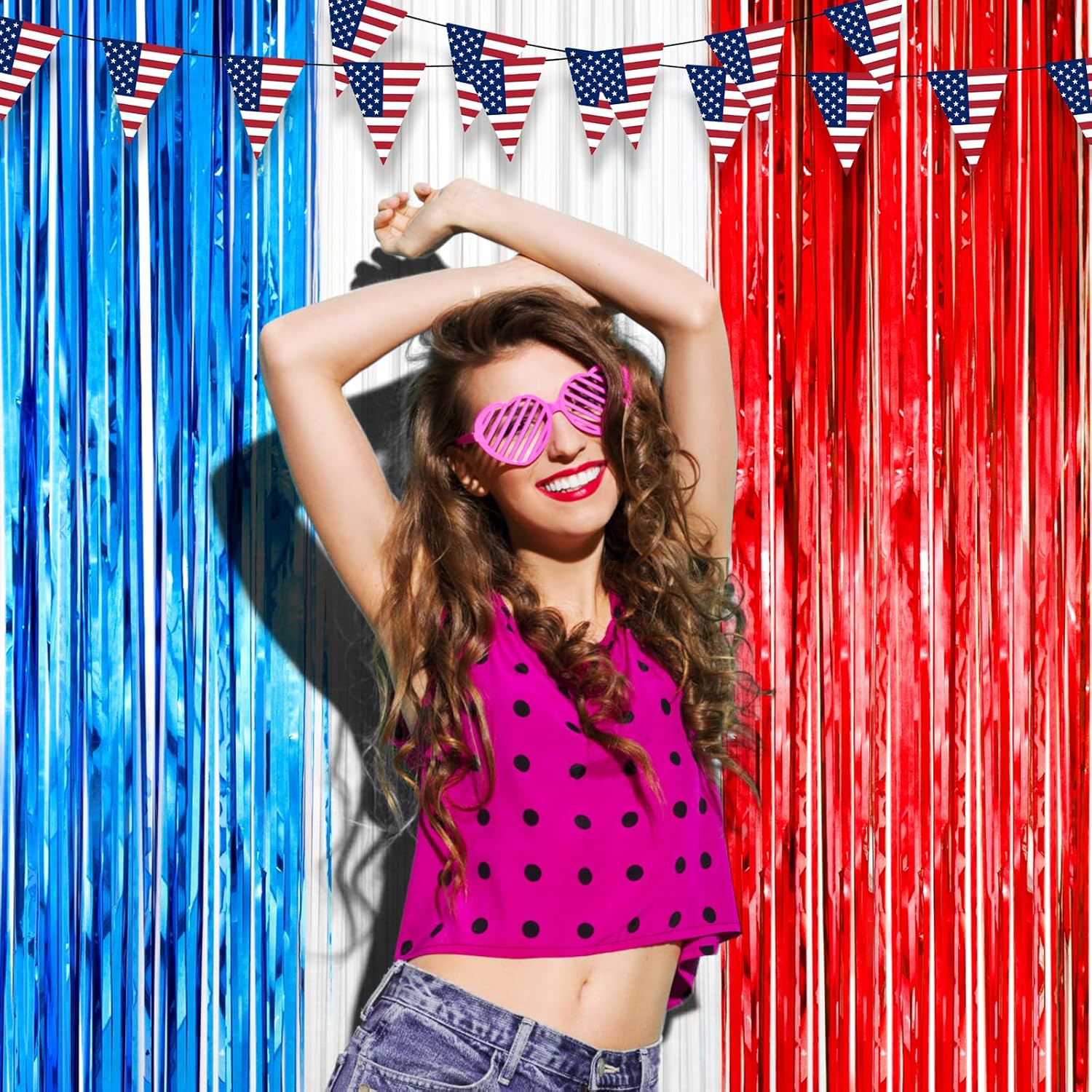 3 Pack 3.3 x 8.2 ft Red White and Blue Foil Fringe Backdrop Curtains, Tinsel Streamers Party Decorations, Fringe Backdrop for Patriotic, Memorial Day, 4th of July, Independence Day