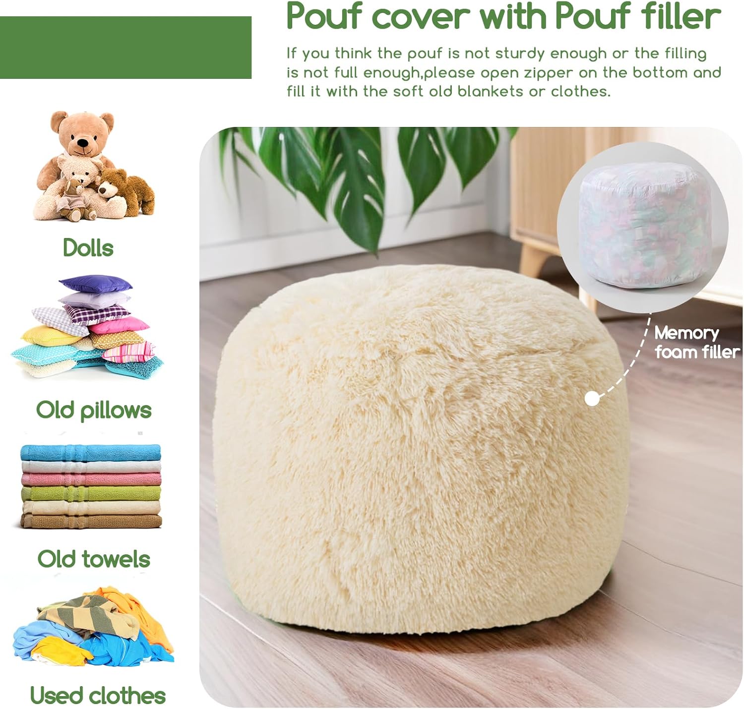 HIGOGOGO Round Stuffed Pouf Ottoman, Long Faux Fur Poufs with Foam Chunk Filling, Fluffy and Furry Pouf Foot Stool Storage Ottoman, 20 X 15 Floor Poufs Foot Rest for Living Room, Beige