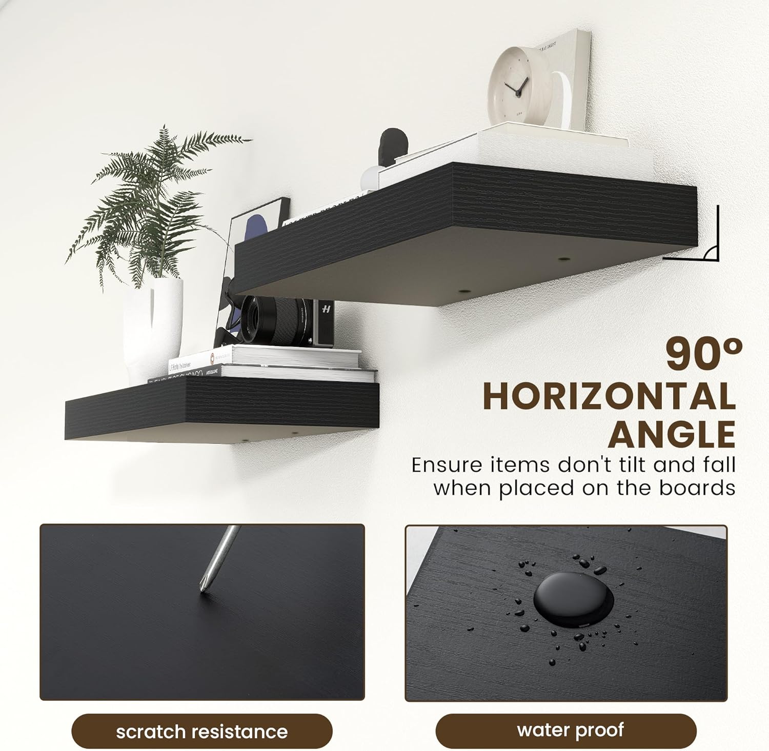 Deep Floating Shelves for Wall, 24W x 12D Black Floating Shelves Set of 2, 12'' Deep Large Wood Shelves for Living Room Bathroom Laundry Room Bedroom Kitchen Home Office - Black