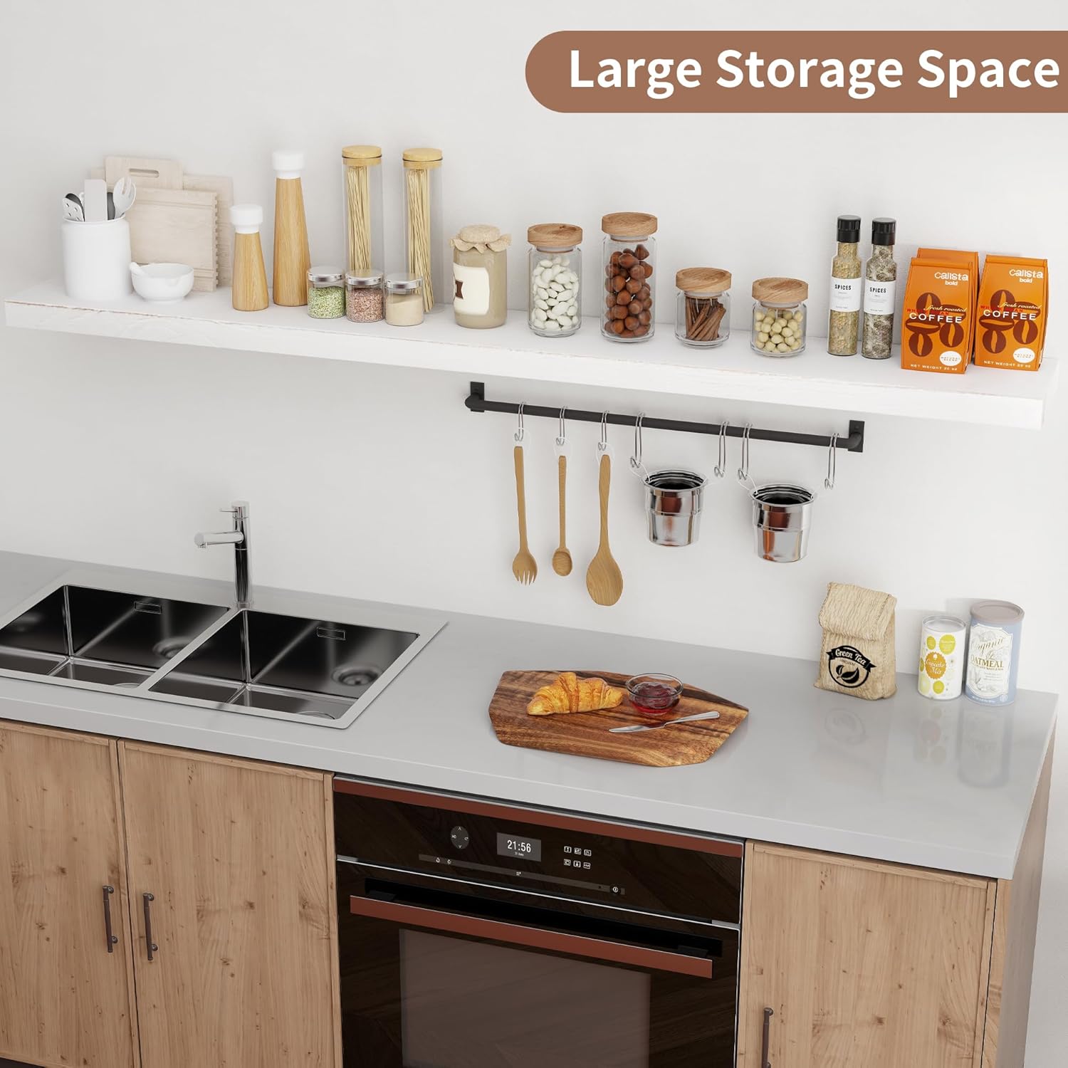 Rustic Elm Wood Floating Shelves - 72'' W x 8" D Wall Mounted Mantel Shelf with Invisible Bracket, Large Long Storage Shelves for Living Room, Bedroom, Kitchen, Bathroom, White Wash