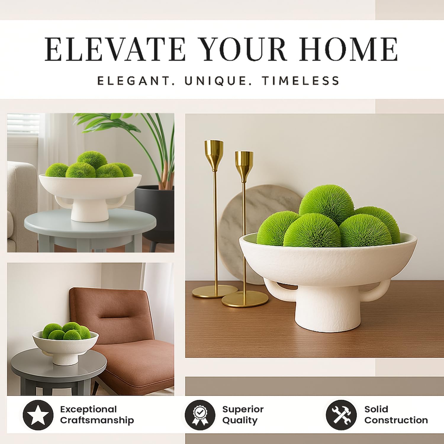 Luxurious White Textured Ceramic Bowl and Greenery Set,12.5x10.5 Inch Pedestal Decorative Bowl, with 6 Green Succulent Moss Balls, Counter Top, Farmhouse Table Centerpiece, Living Room, Kitchen Decor